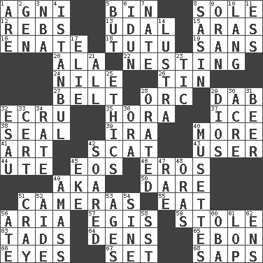 ACROSS 1. Hindu god of fire 5. Storage container 8. Flatfish 12. Confederate soldiers (slang) 13. Allodial 15. Ancient river in northeast Turkey 16. Maternal 18. Ballerina skirt 19. Without 20. Wing 22. Inhabiting a nest 24. Mediterranean tributary 26. Shallow baking pan 27. Waist strap 28. The grampus (Milton) 29. Pat or tap gently 32. Shade of tan 35. Israeli folk dance 37. Frozen water 38. Lick closed 39. Retirement account (abbr.) 40. Greater amount 41. Tate display 42. Leave at once 43. One who uses or employs something 44. Shoshoni 45. Greek goddess of the dawn 46. Greek god of love 49. Alias (abbr.) 50. Have the gumption 51. Devices for capturing images 55. Ingest 56. Roberta Peters solo 57. Armor plate that protects the chest 59. Took without asking 63. Bits 64. Hiding places for outlaws 65. Inky black, to poets 66. Snake ____ (dice throw) 67. Arrange properly for use 68. Plant excrements DOWN 1. "We ___ not amused" (Victoria) 2. Commissioned mil. rank 3. Basketball assoc. 4. Byzantium, centuries later 5. With the exception that 6. Goddess of spring and wife of Bragi 7. Nathan's nickname 8. Indian antelope 9. Northwest Algerian city 10. Long (Scottish) 11. Curvy letter 14. A period of five years 17. Writer Wiesel 21. Everything 23. Nervous spasm 25. Principles of right and wrong 28. Spoke pompously 29. "Vaya con ____" 30. Land measure 31. Fermented drink made from hops 32. He sold his birthright 33. Sure thing 34. Assign a rank or rating to 36. Mouth or opening 40. French bagpipes 42. Flew 45. Make supply last 47. Actress Charlotte 48. Mouths or openings 49. Collect or gather 51. Supercomputer manufacturer 52. Helper 53. Eons 54. Trig term 56. Had dinner 58. Fast jet (abbr.) 60. Chief or king in Benin or Nigeria 61. Trim (branches) 62. Followers of ems