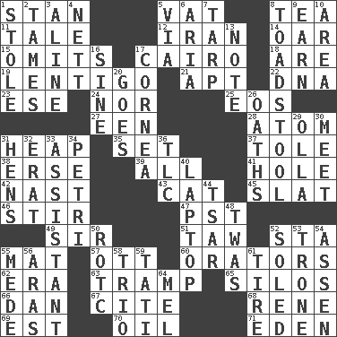 ACROSS 1. Comedian Laurel of Laurel & Hardy 5. Large container 8. Afternoon social gathering 11. Lie 12. SW Asia republic 14. Boat paddle 15. Leaves out 17. Capital of Egypt 18. "We ___ not amused" (Victoria) 19. Small, flat, pigmented spot on the skin 21. Fitting 22. Heredity factor (abbr.) 23. Compass dir. 24. Or not 25. Greek goddess of the dawn 27. Car or cant ending 28. Tiny particle 31. Pile 35. Arrange properly for use 37. Lacquered or enameled metalware 38. Celtic language 39. Everything 41. Opening into or through something 42. Political cartoonist Thomas 43. Domesticated feline 45. Narrow board 46. Agitate 47. Pacific Standard Time (abbr.) 49. Title for a knight 51. The 23rd letter of the Hebrew alphabet 52. R.R. building 55. Floor covering 57. Baseball player Mel 60. Speakers 62. Period 63. _____ steamer (cargo ship) 65. Grain storage towers 66. One of the 12 tribes of Israel 67. Quote 68. French philosopher Descartes 69. Eastern Standard Time (abbr.) 70. Lubricate 71. Locale of original sin DOWN 1. Took without asking 2. Makes less strong or intense 3. Place in a line 4. Remaining after all deductions 5. By way of 6. Operatic vocal solo 7. Canvas cover 8. Inedible or poisonous agaric 9. Merit 10. Length times width 13. Observe 16. Trig term 17. Pupil covering 20. Travels 26. Profane or obscene expressions 29. Water jar 30. Confront 31. Coop moms 32. Part of Q.E.F. 33. Helper 34. _ dish (used to culture cells) 36. Affectionate concern, for short 40. Portable computer 44. Russian ruler of old 48. It was, poetically 50. College mil. group 52. Having a sole or soles 53. Marketplace scale 54. NE Netherlands city 55. Ancient Persian 56. Ancient river in northeast Turkey 58. Musical group of three 59. Jacques of French films 61. Hoop that covers a wheel 64. Cartoonist voice _ Blanc