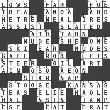 ACROSS 1. Coldest temperatures 5. Distant 8. Enemy 11. The content of cognition 12. Small Philippine buffalo 14. Say or write further 15. Distance measurement (Brit.) 17. Be tempered by heat 18. Angers 19. Aid 21. Scheduled 23. Assist 25. Bits 26. Naked 27. A female animal or person 28. Single 31. What Jean-Claude Killy likes to do 33. Ewer handle 35. Unclothed pictures 37. Highlander 38. Director Reiner 40. Allows 41. Navigate 43. Lubricate 45. Nonscientific branch of learning 46. The 18th letter of the Arabic alphabet 47. Bear (Spanish) 50. A really long time 52. Play the lead 53. Plant excrement 54. Moe Howard, for one 56. Sunflower state 61. Beverages made from leaves 62. Writer Wiesel 65. White Person, in Hawaii 66. Actor Linden 67. Fast planes 68. Pack (down) 69. Compass dir. 70. Ingest 71. Part of Q.E.F. DOWN 1. Pale green bean 2. Lyric poems 3. Moistens 4. Indian skirt 5. Air blower 6. A saturated hydrocarbon 7. Ridicules or criticizes harshly 8. Conductor's collection 9. Wrote a lyric poem 10. Begley and Asner 13. Assad's deity 16. He sold his birthright 18. ___ a Wonderful Life 20. Periodic rise and fall of the sea level 22. Arabian gulf 24. Letter starter 26. The longest river in the world 28. Baltic tributary 29. Remaining after all deductions 30. Double-curved letter 31. Suttee (variant) 32. Peachy ____! 34. Friend of Pooh 36. Uhlan (variant) 37. Girls' org. (abbr.) 39. Prejudice 42. Printing process, for short 44. Path through which fluid escapes 48. Gurus 49. Threatening words 51. Brightly colored fish 52. Mayday 54. Oceans 55. Falsehood 57. Nathan's nickname 58. Fly high 59. _ mater 60. Back-to-school mo. 61. Definite Article 63. Call ___ day 64. Eastern Standard Time (abbr.)