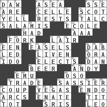ACROSS 1. Fool 4. Toward the sea 8. Compass dir. 11. "We ___ not amused" (Victoria) 12. Cell (Danish) 14. Highlander 15. Shout 17. Musical pauses 18. Baby powder 19. Deli grouping 21. Learning spot: Fr. 23. Possessed 24. Auto club (abbr.) 25. Tined utensil 27. Den 30. Car or cant ending 31. Artist's stands 34. Small moist lump or mass 37. Directed 38. Make or become more lively 39. Mouth or opening 40. Wedding promise 41. Chooses 43. Daniel's nick name 44. Fermented drink made from hops 45. Actor Griffith 47. Australian flightless bird 49. Bear (Spanish) 50. Exchange 52. More impudent 56. Overturn; upset 57. Viva Las _ 60. Inside; within (prefix) 61. Curves 62. Related on the mother's side 63. Teat (slang) 64. Small child 65. Indian titles of respect 66. Lion DOWN 1. 24-hour periods 2. Type of rug 3. Water source 4. Bitter 5. Observes 6. Raised railways 7. Keyboard modifier key 8. Any of the three canals of the cochlea 9. Flatfish 10. And so on (abbr.) 13. Compass dir. 14. Portico 16. Cowardly lion portrayer 20. Cause to be 22. Auto 25. Nourish 26. Southwest Nigerian state 27. Prying instrument 28. Actor Baldwin 29. Is not 30. Biblical high priest 32. Toward shelter 33. Drop; flow; fall 34. Texas town _ City 35. Like ___ of sunshine 36. Prohibit 42. Backtalk 44. Partially opened flower 46. Olfactory organ 47. Spew [out] 48. Atlas contents 49. Fertile tracts in a desert 50. "Corrida" creature 51. First lady 52. Suttee (variant) 53. International (abbr.) 54. Singer Brickell 55. Printing process, for short 56. Feline 58. Followers of ems 59. Slender fish