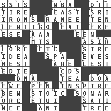 ACROSS 1. Fast planes 5. Basketball assoc. 8. Baseball player Mel 11. Hoop that covers a wheel 12. Compass direction 14. Indian title of respect (Mr.) 15. Removes the wrinkles 17. Indian princess (variant) 18. "___ Little Indians" 19. Small, flat, pigmented spot on the skin 21. Erode 22. Supplement with great effort 23. Compass dir. 24. American Automobile Association (abbr.) 25. Car or cant ending 27. Mountains (abbr.) 28. SW Saudi Arabia district 31. Old wives' tales, e.g. 35. And so on (abbr.) 37. Beget 38. The main thing one is thinking about 39. Health resort 41. Nights before holidays 42. Egg locale 43. "We ___ not amused" (Victoria) 45. For fear that 46. Singer Brickell 47. Music discs 49. Heredity factor (abbr.) 51. Afternoon social gathering 52. ___ good deed 55. She-sheep 57. Writing instrument 60. Stimulate to action 62. Benjamin's nick name 63. Unemotional 65. Echolocation 66. The grampus (Milton) 67. Needle case 68. Suttee (variant) 69. Born 70. Black tropical American cuckoo 71. Relationship diagram DOWN 1. Vertical member of a panel or frame 2. Founders of families 3. Marketplace scale 4. Emitted 5. Teachers' org. 6. Object of repulsion 7. At sea 8. Clearly or manifestly demonstrative 9. Long journey 10. Prong on a fork 13. Wig 16. Thailand, formerly 17. Ridicules or criticizes harshly 20. Yard entry 26. Artist's stand 29. Angers 30. Repose 31. Actor's bit 32. Wrote a lyric poem 33. Home 34. Ingested 36. Accounting whiz (abbr.) 40. Northern region 44. Genesis locale 48. Backtalk 50. Domed church section 52. Middle Eastern gold or silver currency 53. Speak pompously 54. Nest on high 55. Inky black, to poets 56. Past tense of be (plural) 58. Singer James 59. Part of speech 61. Mail 64. One more than two