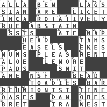 ACROSS 1. Silent film actress Nazimova 5. Benjamin's nick name 8. Fails to keep up a pace 12. Thailand, formerly 13. "We ___ not amused" (Victoria) 14. It is permitted: Lat. 15. South American Indian 16. Producing rotation 19. Sorrow 20. Choose not to consume 21. Fast planes 23. Had dinner 24. Atlas unit 27. Froth on beer 30. Scottish caps 31. Artist's stands 34. Makes supply last 35. Religious women 38. Entreaties 40. Monthly bill 41. _ vera 42. Poe poem 44. Writing tablets 45. In a ____ (agitated or irritated) 46. A saturated hydrocarbon 47. Science/research agcy. 50. Necklace unit 53. Sycophants 57. Drinking establishment 59. One who advocates reunion 63. Prong on a fork 64. Fertile tracts in a desert 65. Daniel's nick name 66. Lyric poems 67. Cy Young winner Saberhagen 68. Lyricist Gershwin 69. Compass direction DOWN 1. SW Saudi Arabia district 2. "_ and Lucy" (Charlie Brown theme song) 3. Shoestrings 4. Wet nurse (var.) 5. Sharp remark 6. Greek god of love 7. Remaining after all deductions 8. 54 in ancient Rome 9. Adept person 10. Set 11. Filthy place 14. Actor's bit 17. American Automobile Association (abbr.) 18. Teat (slang) 20. At sea 22. College papers 24. Create 25. So be it 26. Inconspicuous attention getter 28. Viper 29. Small valley 30. Cigar-shaped 32. Area sheltered from the wind 33. Without 35. California wine valley 36. ____ Bator 37. Thickened enlargement 39. Male offspring 43. Teases 47. Nuclear Threat Initiatives 48. "Barney Miller" actor Jack 49. Avid follower 51. Stay 52. Natives or inhabitants of Denmark 54. "You Light Up My Life" star Conn 55. Austrian river, tributary to the Danube 56. Inactive volcano in Sicily 58. Respite 59. Director Reiner 60. Ewer handle 61. Purpose 62. Fish or hair follower 63. Pull behind