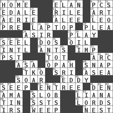 ACROSS 1. Dwelling 5. Style 9. Personal Computers (abbr.) 12. Peak District village in England 14. Cause heat under the collar 15. Nonscientific branch of learning 16. Nest on high 17. Toward shelter 18. Lion 19. Before (prefix) 20. Portable computer 23. Entreaty 24. SW Saudi Arabia district 25. Live dramatic performance 27. Sew up the eyelids of hawks and falcons 30. Two (Sp.) 32. Petroleum 33. International (abbr.) 34. Pismires 36. Mischievous child 38. Pacific Standard Time (abbr.) 39. Small child 40. Curve 43. White ___ sheet 46. Brightly colored fish 48. Fastener 49. Ring climax 51. _ Lanka 52. At sea 53. Fly high 54. Whirlpool 56. Ooze 58. Main course 61. Lair 64. Wet nurse (var.) 65. Oscar Madison type 66. Woody, climbing, usually tropical plant 68. Metal container 69. Fast planes 70. Titled peers of a realm 71. Big collection agency 72. Shed a tear 73. Egg locale DOWN 1. Pile 2. River in Europe 3. Female horse 4. Connecticut Ivy Leaguer 5. Part of Q.E.F. 6. _ and Stitch 7. City in Syria 8. Born 9. Friendly 10. Algonquian 11. Portico 13. Snakelike fish 21. Opera by Verdi 22. Right away 23. Inside of hand 24. 100% 26. Cards in a Roman deck? 27. Small drink 28. Followers of ems 29. Singer James 31. Closes up, plugs up 35. A viewer who gazes fixedly 37. Zero-star reviews 41. Actress Charlotte 42. Tax preparer (abbr.) 44. Cease 45. Alias (abbr.) 47. Flintstone garb 48. Declare 50. Threatening words 53. Seines 55. Small valley 56. Suttee (variant) 57. Independent ruler or chieftain 59. Short letter 60. Cook's measure (abbr.) 61. Have the gumption 62. Extremities 63. Political cartoonist Thomas 65. Compass dir. 67. Electrically charged atom