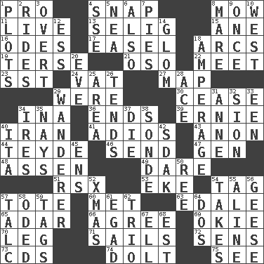 ACROSS 1. Adept person 4. Fastener 8. Cut the grass 11. Moving, as bait 13. Major League Baseball Commissioner Bud 15. One (Scot) 16. Lyric poems 17. Artist's stand 18. Arches 19. Laconic 21. Bear (Spanish) 22. Confront 23. Fast jet (abbr.) 24. Large container 27. Atlas unit 29. Past tense of be (plural) 30. Stop 34. _ tizzy (2 wds.) 36. Extremities 39. Bert's buddy 40. SW Asia republic 41. Goodbye (Sp.) 43. Soon (poet.) 44. Miss Universe 1986, Barbara Palacios _ 46. Transmit 47. Commissioned military rank (abbr.) 48. NE Netherlands city 49. Have the gumption 51. Acura sports coupe 53. Make supply last 54. Label 57. Carry 60. Was introduced to 63. Peak District village in England 65. The sixth month of the Jewish calendar 66. Match 69. Migrant worker of the '30s 70. Part of a journey 71. Travel by water 72. Elected reps. 73. Music discs 74. Dunce 75. Observe DOWN 1. Schemes 2. Amusement-park features 3. Unconcealed 4. Compass dir. 5. Teachers' org. 6. In addition 7. Sliced desserts 8. Female horse 9. At one time in the past 10. Compass direction 12. Curvy letter 14. Seize upon or latch onto something 18. Electrical Measurement 20. First lady 25. Type of rug 26. Looks after 28. Adept person 29. Nomad 31. Singer Murray 32. The Jewish people; Israel 33. Car or cant ending 34. Angers 35. Negative votes 37. Pass on 38. Message 40. Call ___ day 42. Neighbor of Neb. 45. Followers of ems 50. To sift 52. Dec. holiday 54. Receives possession of 55. Place in a line 56. Honkers 57. Baby powder 58. Wrote a lyric poem 59. Labels 61. Mild oath 62. Musical group of three 64. Two (Sp.) 67. Pipe bend 68. Eastern Standard Time (abbr.)