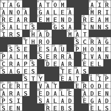 ACROSS 1. Label 4. Tiny particle 8. Atmosphere 11. Small Philippine buffalo 13. An organ shaped like a helmet 15. Medical imaging device (abbr.) 16. Hitchcock's "____ Window" 17. Make improvements or corrections to 18. 480, 500 or 516 sheets of paper 19. Table seasonings 21. Girls' org. (abbr.) 22. Restaurants 23. Big collection agency 24. Possessed 27. Floor protector 29. Through, poetically 30. Strangle with an iron collar 34. Compass dir. 36. He sold his birthright 39. Give a jingle 40. Inside of hand 41. Father Junipero _ 43. _ the terrible 44. Dice game 46. Letter starter 47. Snakelike fish 48. Gurus 49. Afternoon social gatherings 51. Filthy place 53. Consume 54. Mouth edge 57. Foregone conclusion 60. Large container 63. Eat (away) 65. Ancient river in northeast Turkey 66. Peak District village in England 69. Arabian gulf 70. Air pressure measure (abbr.) 71. First course 72. Mild oath 73. Elected rep. 74. Confederate soldiers (slang) 75. Raised railways DOWN 1. Tarsus (plural) 2. Approach 3. Finish lines 4. Ripen 5. Scottish cap 6. Cassini of fashion 7. Not women's 8. So be it 9. SW Asia republic 10. Basketball hoops 12. Tate display 14. First of billions? 18. Actors Guy, Robert Welles, and Clint 20. Quiet! 25. Ancient Greek god of war 26. Administered medicine 28. Cleo's killer 29. Storms 31. Be footloose 32. Of or related to the anus 33. Commissioned mil. rank 34. "Two Mules for Sister ____" 35. Volcanic refuse 37. "We ___ not amused" (Victoria) 38. A salt of uric acid 40. Personal Computers (abbr.) 42. Type of rug 45. Fast jet (abbr.) 50. Had dinner 52. Jacques Cousteau's middle name 54. Inn 55. Standard of perfection 56. Hangs 57. Smile enhancers 58. Celtic language 59. Water falling in drops from the sky 61. The sixth month of the Jewish calendar 62. Lie 64. Actress Charlotte 67. Experiment locale 68. Begley and Asner