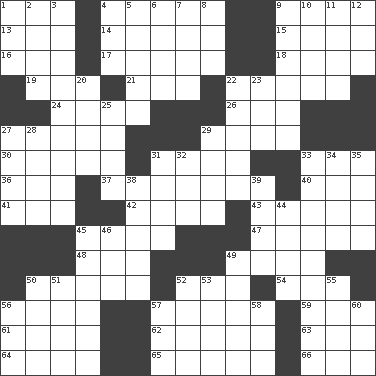 ACROSS 1. Order of Saint Francis (abbr.) 4. Odor 9. Seaweed 13. Teachers' org. 14. Declaim 15. SW Saudi Arabia district 16. Snakelike fish 17. Indian antelope 18. Billionth: prefix 19. Compass dir. 21. It is so 22. Come out of 24. Blunders 26. Tax preparer (abbr.) 27. Giggle 29. Oceans 30. U. of Maine site 31. Ache 33. Small child 36. Bear (Spanish) 37. Deli grouping 40. Alias (abbr.) 41. Directed 42. Pile 43. Major League Baseball Commissioner Bud 45. Length times width 47. Falsehoods 48. Sound made by sheep 49. Inconspicuous attention getter 50. Stared at amorously 52. According to 54. Bar bill 56. Stare at amorously 57. Place in a line 59. Experiment locale 61. Ancient Greek god of war 62. Table seasonings 63. Compass dir. 64. Monthly bill 65. Came up 66. Elected rep. DOWN 1. Single 2. Perceives with the eye 3. It jiggles the polygraph 4. Distress signal 5. Trading vessels 6. Relaxation 7. Nuclear Threat Initiatives 8. Nine, plus one 9. Sunflower state 10. He sold his birthright 11. Actor's bit 12. Adept person 20. Songbird 22. Ancient Celtic tribe of eastern Britain 23. Health resort 25. Vintage cars 27. Utensil 28. Celtic language 29. Simple or foolish person 31. Entreaty 32. American Automobile Association (abbr.) 33. Baron Munchausen's specialties 34. Migrant worker of the '30s 35. Labels 38. Toward the future 39. Fast planes 44. Compass direction 45. Most capable 46. Actress Charlotte 49. Leg coverings 50. Legendary monster 51. Small, secluded valley 52. Having or resembling wings 53. _ and Stitch 55. Object of repulsion 56. Rowing implement 57. White ___ sheet 58. Compass dir. 60. Benjamin's nick name