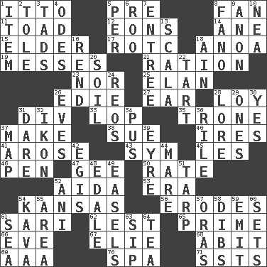 ACROSS 1. "Tell ____ the Marines!" 5. Before (prefix) 8. Air blower 11. Frog relative 12. Immeasurably long periods of time 14. A saturated hydrocarbon 15. A person who is older than you are 17. College mil. group 18. Small Philippine buffalo 19. Makes clutter 21. Food allowance for one day 23. Not either 25. Enthusiasm 26. Singer Brickell 27. Ewer handle 28. Myrna of the movies 31. HTML Container Element 33. Trim (branches) 35. Marketplace scale 37. Cause to be 38. Institute legal proceedings 40. Angers 41. Came up 43. Symbol (abbr.) 45. French article 46. Fenced enclosure 47. Unit of force equal to gravity 50. Pace 52. Opera by Verdi 53. Epoch 54. Sunflower state 56. Eats (away) 61. Indian skirt 62. For fear that 65. A-one 66. Night before a holiday 67. Writer Wiesel 68. "This won't hurt ____!" 69. Auto club (abbr.) 70. Health resort 71. Fast planes DOWN 1. A distinct part 2. Lacquered or enameled metalware 3. Small amounts or degrees 4. Lyric poems 5. For each 6. Friend of Pooh 7. Main course 8. Papal veil 9. Soon (poet.) 10. Teachers' org. 13. Any of the three canals of the cochlea 16. Tear apart 18. The 18th letter of the Arabic alphabet 20. The visible part of the earth's surface 22. Small pie 24. Vintage cars 26. Nights before holidays 28. Old wives' tales, e.g. 29. Washington bills 30. Consenting reply 31. Have the gumption 32. Picture 34. Suppuration 36. Cause heat under the collar 37. Atlas unit 39. Jane of fiction 42. Armor plate that protects the chest 44. Female horse 48. Peak District village in England 49. Artist's stands 51. Canvas cover 52. Black tropical American cuckoo 54. Polynesian shrub of the pepper family 55. Type of rug 57. Mouths or openings 58. Rights 59. Send forth 60. Puts into a specified state 61. Ocean 63. Small drink 64. Beverage made from leaves