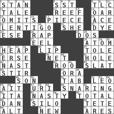 ACROSS 1. Comedian Laurel of Laurel & Hardy 5. Fast jet (abbr.) 8. Affectionate concern, for short 11. Lie 12. Coral ridge 14. Boat paddle 15. Leaves out 17. Part 18. Adept person 19. Small, flat, pigmented spot on the skin 21. A female animal or person 22. Color 23. Compass dir. 24. Strike 25. Two (Sp.) 27. Snakelike fish 28. Smallest unit of an element 31. Pile 35. Mouth edge 37. Lacquered or enameled metalware 38. Celtic language 39. Fish or hair follower 41. Hollow 42. Political cartoonist Thomas 43. Friend of Pooh 45. Narrow board 46. Move through with a circular motion 47. Mouth or opening 49. Boy, to dad 51. Bar bill 52. Lion 55. Small island 57. RI univ. 60. Catching in a trap 62. Call ___ day 63. Offensive 65. Add up to 66. One of the 12 tribes of Israel 67. Grain storage tower 68. False hair 69. Keyboard modifier key 70. ___ Haven, CT 71. Ancient Greek god of war DOWN 1. Took without asking 2. Domesticates 3. Place in a line 4. Remaining after all deductions 5. _ Lanka 6. Observes 7. Technician 8. Inedible or poisonous agaric 9. Made of lace 10. Algonquian 13. Nourish 16. The founder of a family 17. Cotton for raincoats, e.g. 20. Highlander 26. Expletives 29. Water jar 30. Rendezvous 31. Coop moms 32. Part of Q.E.F. 33. Aide 34. Stone: prefix 36. For each 40. Tootsie (variant) 44. NW Algerian seaport 48. Blind as ____ 50. Religious women 52. 61 cubic inches 53. Maternal 54. Stares at amorously 55. Opera by Verdi 56. Slanted text style (abbr.) 58. Water falling in drops from the sky 59. Small island 61. Round or rotation of duties 64. Pull behind