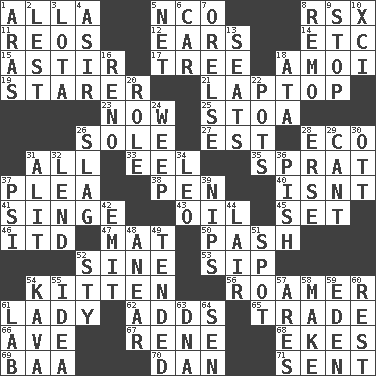 ACROSS 1. Silent film actress Nazimova 5. Non-commissioned officer (abbr.) 8. Acura sports coupe 11. Vintage cars 12. Hearing organs 14. And so on (abbr.) 15. Moving about 17. Woody plant 18. Mine, in Marseilles 19. A viewer who gazes fixedly 21. Portable computer 23. At this time 25. Portico 26. Not divided or shared with others 27. Eastern Standard Time (abbr.) 28. Environmental prefix 31. 100% 33. Snakelike fish 35. Small fatty European fish 37. Entreaty 38. Animal enclosure 40. Is not 41. Burn superficially 43. Lubricate 45. Arrange properly for use 46. It would 47. Floor protector 50. Romantic infatuation 52. Trig term 53. Small drink 54. Baby cat 56. Wanderer 61. Kenny Rogers chart-topper in '80 62. Sums up 65. Barter 66. "___ Maria" 67. French philosopher Descartes 68. Makes supply last 69. Sound made by sheep 70. Daniel's nick name 71. Transmitted DOWN 1. Caspian sea tributary 2. For fear that 3. Globular water bottle used in Asia 4. SW Saudi Arabia district 5. Fish or hair follower 6. 4-wheeled motor vehicle 7. Threatening words 8. San ____ (Riviera town) 9. Constrict 10. One more than ninety 13. Theater features 16. Western Nevada city 18. _ moment's notice (2 wds.) 20. Hero or heavy, e.g. 22. Cooking vessels 24. Shed a tear 26. Volcanic refuse 28. Celtic language 29. Patter 30. Baseball player Mel 31. Set down 32. Grant temporary use of 34. Lion 36. Expression of disdain 37. 23rd letter of the Greek alphabet 39. Pinches, bites 42. Send forth 44. Den 48. Approach 49. Watched over 51. Specific locale 52. Filthy place 54. Polynesian shrub of the pepper family 55. It may be bright or harebrained 57. Ancient Greek god of war 58. Cause to be 59. Genesis locale 60. Take ten 61. Experiment locale 63. Heredity factor (abbr.) 64. Elected rep.