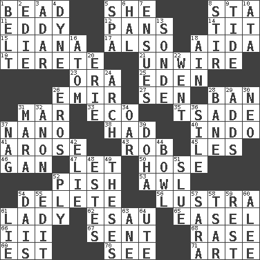 ACROSS 1. Necklace unit 5. A female animal or person 8. R.R. building 11. Whirlpool 12. Zero-star reviews 14. Teat (slang) 15. Woody, climbing, usually tropical plant 17. In addition 18. Opera by Verdi 19. Cylindrical with tapered ends 21. Undo the wiring of 23. Mouth or opening 25. Paradise 26. Arab leader 27. Elected rep. 28. Prohibit 31. Third mo. 33. Environmental prefix 35. Sadhe (variant) 37. Billionth: prefix 38. Possessed 40. Southeast Asian peninsula 41. Came up 43. Director Reiner 45. French article 46. Separate the seeds from cotton 47. Allow 50. Flexible conduit 52. Expression of disdain 53. Leather borer 54. Erase 56. A period of five years 61. Kenny Rogers chart-topper in '80 62. Son of Isaac 65. Artist's stand 66. One more than two 67. Posted 68. Raze (variant) 69. Eastern Standard Time (abbr.) 70. Perceive with the eye 71. Johnson of "Laugh-In" DOWN 1. Waist strap 2. Singer Brickell 3. The sixth month of the Jewish calendar 4. Centimeter-gram-second unit of force 5. Health resort 6. Actor Linden 7. Follows as a consequence or result 8. Disorderly outburst 9. Periodic rise and fall of the sea level 10. _ moment's notice (2 wds.) 13. Message 16. Tiny particle 18. The 18th letter of the Arabic alphabet 20. 4th largest of the Great Lakes 22. Left 24. Bowlike part 26. Greek god of love 28. Object of repulsion 29. Sums up 30. Modern: prefix 31. Hindu Mythology: god of death 32. Soon (poet.) 34. Rowing implement 36. Filth; sediment 37. Tired old horse 39. Capital of the state of Qatar 42. Writer Wiesel 44. Soup holder 48. _____ Park, CO 49. College papers 51. Change direction abruptly 52. Travel a route regularly 54. Raised platform 55. Prepare for publication 57. "Two Mules for Sister ____" 58. Russian ruler of old 59. Remainder 60. Toward shelter 61. Untruth 63. A saturated hydrocarbon 64. Shoshoni