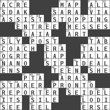 ACROSS 1. 1/640 square mile 5. Atlas unit 8. 100% 11. Neighbor of Neb. 12. "Two Mules for Sister ____" 13. By way of 14. Help 17. Discontinuing 19. Main course 21. Makes clutter 22. Greek goddess of the earth (variant) 23. Nonscientific branch of learning 24. Mischievous 27. Mail 29. Keyboard key 32. Team commander 34. Period 36. Lie 37. Legendary monster 38. Pet locale 39. Silent film actress Nazimova 40. Billionth: prefix 41. Small drink 42. Perfect 43. Followers of ems 44. Adolescent 46. A female animal or person 47. Parent Teacher Assoc. 50. Caspian sea tributary 52. A viewer who gazes fixedly 55. Right away 57. News announcer 59. Beer mug 62. ___ a Wonderful Life 63. Drop; flow; fall 64. Farming town in central California 65. Perceive with the eye 66. Snakelike fish 67. Celtic language DOWN 1. White ___ sheet 2. Music discs 3. Raze (variant) 4. Supplementing with great effort 5. Floor protector 6. Odor 7. Some stationery 8. Opinion 9. Actor's bit 10. Falls behind 12. Compass dir. 15. Staphylococcus 16. Musical group of three 18. Pacific Standard Time (abbr.) 20. Artist's stands 24. Biscuitlike quick bread 25. Utah city north of Ogden 26. Tall tales 28. Distinguishing feature 29. Falsehoods 30. Assad's deity 31. Calif. Air Force Base 33. Corporate head (abbr.) 35. Become visible 36. Small amount or degree 42. Empty; void 45. Greek god of love 47. Adept person 48. Laconic 49. Nick name for Arthur 51. Vertical member of a panel or frame 52. Indian titles of respect 53. False hair 54. Domed church section 55. Before (prefix) 56. Scent 58. Pipe bend 60. Begley and Asner 61. Whopper