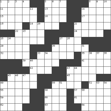 ACROSS 1. Nathan's nickname 5. Raised railways 8. Part of HMS, perhaps 11. Approach 13. Two (Sp.) 14. Pacific island yam 15. Thick mixture 16. Compass dir. 17. Spoken 18. Keyboard modifier key 19. Volcanic refuse 21. A salt of uric acid 22. To the inside or interior of 24. Old wives' tales, e.g. 25. Buttonhole 27. Insect wing 29. Friends 30. Happening 32. Woody plant 33. Flower holders 35. Mitch Miller's instrument 39. Hits or strikes with great force 41. Component 42. "One Day ___ Time" 43. Medicinal drug used to evoke vomiting 45. Farming town in central California 48. Keg 49. Prying instrument 50. Collude with 52. Scottish cap 55. Sign of something about to happen 56. Mature 57. Peak District village in England 59. Undersized animal 60. _ tizzy (2 wds.) 61. High-strength synthetic material 62. Big collection agency 63. To free from 64. Makes supply last DOWN 1. California wine valley 2. Of or related to the anus 3. A testis 4. Ingest 5. Pulitzer Prize-winning author Ferber 6. Having great length 7. Compass dir. 8. Ethiopian city, capital of Harari 9. Feeling or showing extreme anger 10. Flatfish 12. Musical pauses 14. "Corrida" creature 20. Car dealer's back yard 21. Uhlan (variant) 23. Olfactory organs 25. Fitting 26. Auto 27. "___ Maria" 28. French article 30. Double-curved letter 31. Drinks excessively 33. Large container 34. Housemaid (var.) 36. Sass 37. Mouth or opening 38. And so on (abbr.) 40. Den 43. Frozen water 44. Eucharist need 45. Arboreal primate 46. Baking chambers 47. Gouge 49. Australian parrot (variant) 50. Hindu god of fire 51. Necklace unit 53. _ vera 54. Not women's 56. Wind 58. Color