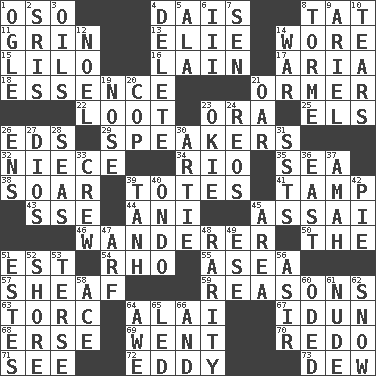 ACROSS 1. Bear (Spanish) 4. Raised platform 8. Make lace 11. Smile widely 13. Writer Wiesel 14. Had on 15. _ and Stitch 16. (Had) reclined 17. Roberta Peters solo 18. Substance 21. Channel Islands abalone 22. Plunder 23. Mouth or opening 25. Raised railways 26. Begley and Asner 29. Orators 32. Sibling's daughter 34. River (Sp.) 35. Ocean 38. Fly high 39. Lugs 41. Pack (down) 43. Compass dir. 44. Cuckoo 45. Slender Brazilian palm 46. Roamer 50. Definite Article 51. Eastern Standard Time (abbr.) 54. 17th letter of the Greek alphabet 55. At sea 57. To gather and bind into a bundle 59. Thinks logically 63. Torque (variant) 64. Jai ____ 67. Goddess of spring and wife of Bragi 68. Celtic language 69. Left 70. Do over again 71. Perceive with the eye 72. Whirlpool 73. Morning condensation DOWN 1. Stare 2. Indian titles of respect 3. Petroleums 4. Erase 5. Chicken ___ king 6. One more than two 7. Elected rep. 8. Singer Mel 9. Satellite of Uranus 10. Separates forcefully 12. Christmas carol 14. Armed conflict 19. Characteristic smell of wine 20. Police officer (slang) 21. Rowing implement 23. Migrant worker of the '30s 24. Vintage cars 26. Followers of ems 27. "Vaya con ____" 28. Oceans 30. Nick name for Arthur 31. Fast planes 33. Group working together 36. Compass direction 37. Wet nurse 39. Hyperbolic tangent 40. Southwest Nigerian state 42. Sliced dessert 45. Length times width 47. Sandy's bark 48. Noteworthy scarcity 49. Compass dir. 51. _____ Park, CO 52. Dinah or Pauly 53. Laconic 56. SW Saudi Arabia district 58. Adept person 60. Wrote a lyric poem 61. Unadorned 62. Overwhelm 64. Deep reverence 65. Directed 66. Plus