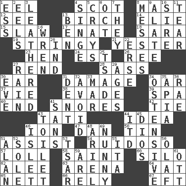 ACROSS 1. Snakelike fish 4. Highlander 8. Vertical spar for supporting sails 12. Observe 13. A tree used for making furniture 14. Writer Wiesel 15. Cole _ (cabbage dish) 17. Maternal 18. "Two Mules for Sister ____" 19. Slender, wiry 21. Of or pertaining to yesterday 23. Layer 24. Eastern Standard Time (abbr.) 26. Portuguese money of account (variant) 27. Tear apart 28. Backtalk 30. Ewer handle 31. Break 34. Boat paddle 37. Compete 38. Elude 39. Health resort 40. Conclusion 41. Sounds asleep 42. Make a knot 43. Jacques of French films 44. The content of cognition 46. Electrically charged atom 47. Daniel's nick name 50. Shallow baking pan 51. Help 54. Boisterous (Brazilian Portuguese) 57. Hang loosely or laxly 58. Inhabitant of Heaven 60. Grain storage tower 62. Toward shelter 63. Sports stadium 64. Large container 65. Remaining after all deductions 66. Have confidence or faith in 67. Lizard (obsolete) DOWN 1. Double-curved letter 2. Snakelike fish 3. Resembling or made to resemble leather 4. Scorch 5. Trading vessels 6. Sep. follower 7. Those people 8. Makes clutter 9. Having winglike extensions 10. Father 11. Separate forcefully 13. Benjamin's nick name 16. Songbird 20. Working for oneself (abbr.) 22. Celtic language 25. Sadhe (variant) 27. Precipitation 29. Eons 30. First lady 31. Scratch 32. Keep away from 33. Third mo. 34. Clearly or manifestly demonstrative 35. Capital of Western Samoa 36. Actress Charlotte 41. Without 43. Bathroom 44. It would 45. "Vaya con ____" 46. Small island 48. Satellite of Uranus 49. Pet term 51. ____ Jay Lerner 52. Flatfish 53. Russian ruler of old 55. Call ___ day 56. Norwegian king 59. "We ___ not amused" (Victoria) 61. Baseball player Mel