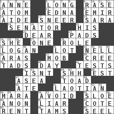 ACROSS 1. Queen of England 1702-14 5. Protracted 9. To erase 13. Smallest unit of an element 14. Pulitzer Prize-winning author Ferber 15. Arab leader 16. Helper 17. Scornful expression 18. "Two Mules for Sister ____" 19. Elected representative 21. Part of HMS, perhaps 22. Letter starter 23. Groovy apts. 24. A female animal or person 27. Single 28. Hero or heavy, e.g. 29. Utah city north of Ogden 31. Car dealer's back yard 32. 1994 drama film starring Jodie Foster 36. Ancient river in northeast Turkey 37. Disorderly crowd 38. Algonquian 39. Bits 40. 24 hours 41. Trials 42. Is not 44. Quiet! 46. Eastern Standard Time (abbr.) 47. Toward the sea 48. Frog relative 50. Had dinner 51. Of or relating to Laos or its people 54. Hindu Mythology: god of death 56. Stay clear from 58. _ gin 60. Soon (poet.) 61. One who doesn't tell the truth 62. ____ d'Azur (French Riviera) 63. Monthly bill 64. Scottish caps 65. Sew up the eyelids of hawks and falcons DOWN 1. Auto club (abbr.) 2. Nuclear Threat Initiatives 3. Thickened enlargement 4. Make improvements or corrections to 5. Poe poem 6. River in Europe 7. Compass dir. 8. Slender fish 9. Dwelling 10. Collect or gather 11. Title for a knight 12. Period 17. Comedian Laurel of Laurel & Hardy 20. Age 21. Actor Linden 23. Cooking vessel 24. Narrow board 25. Israeli folk dance 26. Mild oath 28. Director Reiner 30. Helper 31. Myrna of the movies 33. Celtic language 34. Allows 35. For fear that 37. Floor covering 40. Heredity factor (abbr.) 41. Not this but _ 43. Observe 44. Flight of steps 45. Parka part 47. Composer Copland 49. Flat circles 51. Rich soil 52. _ vera 53. Make mention of 54. Spoil 55. One (Scot) 56. Keyboard modifier key 57. By way of 59. Snakelike fish