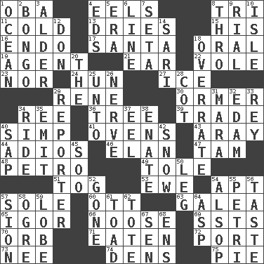 ACROSS 1. Chief or king in Benin or Nigeria 4. Snakelike fish 8. Three (prefix) 11. Chilled 13. Frees from moisture 15. Part of HMS, perhaps 16. Inside; within (prefix) 17. Before Barbara or Clara 18. Taken by mouth 19. Representative 21. Hearing organ 22. Grand slam 23. Or not 24. Attila the _ 27. Frozen water 29. French philosopher Descartes 30. Abalone 34. Portuguese money of account (variant) 36. Woody plant 39. Swap 40. Simple or foolish person 41. Baking chambers 43. Like ___ of sunshine 44. Goodbye (Sp.) 46. Flair 47. Scottish cap 48. Stone: prefix 49. Lacquered or enameled metalware 51. Coat; cloak 53. She-sheep 54. Fitting 57. Flatfish 60. Baseball player Mel 63. An organ shaped like a helmet 65. Composer Stravinsky 66. Trap for birds or small mammals 69. Fast planes 70. Globe 71. Ingested 72. Left side of a ship or aircraft 73. Born 74. Hiding places for outlaws 75. Sliced dessert DOWN 1. Sea 2. Beat drum 3. Tree or shrub in the Birch family 4. Begley and Asner 5. Epoch 6. Actor's bit 7. Stalk of a moss capsule 8. Through, poetically 9. Monetary unit of Yemen 10. Capri or Wight 12. Spanish title 14. Indian skirt 18. Make much ado about nothing 20. Definite Article 25. To (old English) 26. Boldness 28. Small bed 29. Newsperson 31. Hindu Mythology: god of death 32. Dutch treat 33. Marina Del _, California 34. Travel on an animal 35. Give off 37. Snakelike fish 38. Maternal 40. Plant excrement 42. Frozen precipitation 45. "Barney Miller" actor Jack 50. Part of a journey 52. Went 54. Columnist Joseph or Stewart 55. _ dish (used to culture cells) 56. Clothes sense 57. The Jewish people; Israel 58. Legendary monster 59. Ear part 61. Frog relative 62. Carryall 64. Cleo's killer 67. Elected rep. 68. Followers of ems