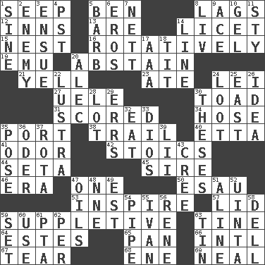 ACROSS 1. Ooze 5. Benjamin's nick name 8. Falls behind 12. Lodging establishments 13. "We ___ not amused" (Victoria) 14. It is permitted: Lat. 15. A home for chicks 16. Happening in regular succession 19. Australian flightless bird 20. Refrain by choice 21. Shout 23. Had dinner 24. Flowery wreath 27. Ubangi River tributary 30. Frog relative 31. Tallied 34. Flexible conduit 35. Left side of a ship or aircraft 38. Go after with the intent to catch 40. Singer James 41. Aroma 42. Unemotional ones 44. Stalk of a moss capsule 45. Title for a man of rank and authority 46. Epoch 47. Single 50. Son of Isaac 53. Heighten or intensify 57. Flaplike covering 59. Supplementary 63. Prong on a fork 64. _____ Park, CO 65. Baking dish 66. International (abbr.) 67. Lacerate 68. Compass dir. 69. Be tempered by heat DOWN 1. Trig term 2. Foe 3. Take place subsequently 4. Pacific Standard Time (abbr.) 5. Sharp remark 6. Greek god of love 7. Remaining after all deductions 8. 54 in ancient Rome 9. Adept person 10. Set 11. Filthy place 14. Actor's bit 17. Auto club (abbr.) 18. Teat (slang) 20. Actor Baldwin 22. A period of five years 24. Spoils 25. Compass direction 26. It may be bright or harebrained 28. Car dealer's back yard 29. Blunders 30. College papers 32. Ingest 33. "Vaya con ____" 35. Introduce or present, as a question 36. River in Europe 37. Round or rotation of duties 39. Cards in a Roman deck? 43. Algonquian 47. Petroleums 48. Compass dir. 49. Eastern Standard Time (abbr.) 51. Place in a line 52. National forest in Provo, Utah 54. Corncob 55. _ the terrible 56. French philosopher Descartes 58. Small valley 59. Put into a specified state 60. Purpose 61. Parent Teacher Assoc. 62. For each 63. Metal container