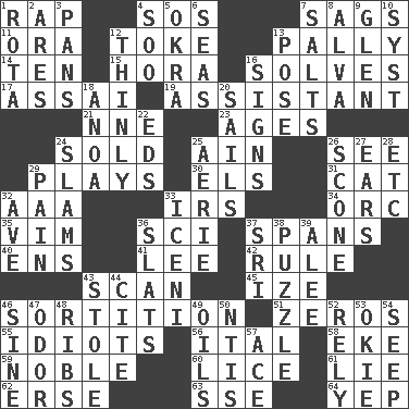 ACROSS 1. Reproach for some lapse or misdeed 4. Mayday 7. Settles 11. Mouth or opening 12. Casino tip 13. Chummy 14. "___ Little Indians" 15. Israeli folk dance 16. Finds the solution 17. Slender Brazilian palm 19. Aide 21. Compass dir. 23. Grows older 24. Exchanged or delivered for money 25. The 18th letter of the Arabic alphabet 26. Observe 29. Romps 30. Raised railways 31. Feline 32. Auto club (abbr.) 33. Big collection agency 34. The grampus (Milton) 35. Zeal 36. _-fi 37. Connects, as a bridge 40. Followers of ems 41. Area sheltered from the wind 42. General guideline 43. Skim 45. Ending with capital 46. Decision 51. Nothings 55. Foolish or stupid persons 56. Slanted text style (abbr.) 58. Supplement with great effort 59. Having high moral qualities 60. Louse (plural) 61. Untruth 62. Celtic language 63. Compass dir. 64. Slangy assent DOWN 1. Roll call or roster of names 2. Ancient Greek god of war 3. Zero-star reviews 4. "Barney Miller" actor Jack 5. Gumbo ingredient 6. Oceans 7. Table seasonings 8. Inventor's middle name 9. Small, secluded valley 10. System (abbr.) 12. Without thickness 13. Airs 16. Attaches a signature 18. Small Philippine buffalo 20. Moves on water 22. Begley and Asner 24. Shuts with force 25. Nest on high 26. Biscuitlike quick bread 27. Hearing organs 28. And so on (abbr.) 29. Ache 32. "___ Maria" 33. Ancient Celtic tribe of eastern Britain 36. Narrow boards 37. Indian title of respect (Mr.) 38. What's this? 39. Toward shelter 43. Took without asking 44. Quote 46. Trig term 47. Scent 48. Chest bones 49. Petroleums 50. Nuclear Threat Initiatives 52. Depend 53. Migrant worker of the '30s 54. Ooze 57. Adept person