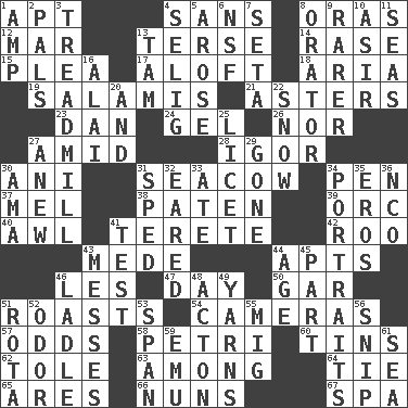 ACROSS 1. Fitting 4. Without 8. Mouths or openings 12. Spoil 13. Laconic 14. To erase 15. Entreaty 17. At or to great height 18. Operatic vocal solo 19. Deli grouping 21. Michaelmas daisies 23. One of the 12 tribes of Israel 24. Set 26. Not either 27. Among 28. Composer Stravinsky 30. Cuckoo 31. Manatee 34. Fenced enclosure 37. Cartoonist voice _ Blanc 38. Eucharist need 39. The grampus (Milton) 40. Leather borer 41. Cigar-shaped 42. Friend of Pooh 43. Ancient Persian 44. Flats, for short 46. French article 47. 24 hours 50. Slender fish 51. Cooks with dry heat, as in an oven 54. Devices for capturing images 57. Probability 58. _ dish (used to culture cells) 60. Canisters 62. Lacquered or enameled metalware 63. Amid 64. Make a knot 65. Ancient Greek god of war 66. Religious women 67. Health resort DOWN 1. Electrical Unit 2. Friends 3. Excercise machine 4. Major League Baseball Commissioner Bud 5. Came up 6. Science/research agcy. 7. Bristle 8. Speaker 9. More uncommon 10. SW Saudi Arabia district 11. Oceans 13. Scottish cap 16. Jai _ 20. Plus 22. Overwhelm 25. It is permitted: Lat. 27. Afresh 29. Went 30. Nanny (var.) 31. Broke a traffic law 32. Having ears or earlike features 33. Had dinner 34. Likenesses of persons 35. Greek god of love 36. Non-commissioned officer (abbr.) 41. Trial 43. Makes clutter 44. Grow older 45. Component 46. Dipping utensil 48. 13-14th century defensive garment 49. Entertaining tales 51. Round or rotation of duties 52. Scent 53. Connect, as a bridge 55. Russian fighter aircraft 56. Clip 59. Australian flightless bird 61. Ocean