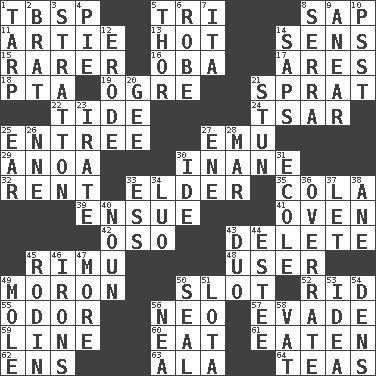 ACROSS 1. Cook's measure (abbr.) 5. Three (prefix) 8. Plant excrement 11. Nick name for Arthur 13. Being at a high temperature 14. Elected reps. 15. Less widely known 16. Chief or king in Benin or Nigeria 17. Ancient Greek god of war 18. Parent Teacher Assoc. 19. Legendary monster 21. Small fatty European fish 22. Periodic rise and fall of the sea level 24. Russian ruler of old 25. Main course 27. Australian flightless bird 29. Small Philippine buffalo 30. Empty; void 32. Monthly bill 33. A person who is older than you are 35. Root beer relative 39. Take place subsequently 41. Baking chamber 42. Bear (Spanish) 43. Keyboard key 45. Tall New Zealand timber tree 48. One who makes use of a thing 49. Person of subnormal intelligence 50. Groove 52. To free from 55. Scent 56. Modern: prefix 57. Elude 59. Actor's bit 60. Consume 61. Eroded 62. Followers of ems 63. Chicken ___ king 64. Beverages made from leaves DOWN 1. Canvas cover 2. Naughty child 3. Ski resort town in Vermont 4. Sliced dessert 5. Son of Odin 6. Loose flowing garment 7. Call ___ day 8. Father Junipero _ 9. Approach 10. Inconspicuous attention getter 12. Wear away 14. Plant excrements 20. Turn to the right 21. Make senseless or dizzy 23. Feeling or showing extreme anger 25. Hearing organ 26. Compass dir. 27. Compass dir. 28. Spoil 30. Binary compound 31. Learning spot: Fr. 33. Double-curved letter 34. Nilotic language 36. Make much ado about nothing 37. Allow 38. One (Scot) 40. Part of speech 43. Superhero pair 44. First name in cosmetics 45. "The Thinker" sculptor 46. Removes the wrinkles 47. Greater amount 49. Undercover agent 50. Lick closed 51. Globular water bottle used in Asia 53. The content of cognition 54. Lairs 56. Teachers' org. 58. Large container