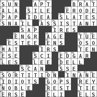 ACROSS 1. Player for Phoenix 4. Fitting 7. Naughty child 11. In the manner of 12. Filth; sediment 13. Wear away 14. Infant food 15. The main thing one is thinking about 16. Chalkboards 17. Slow-paced one 19. Helper 21. Plant excrement 23. Angers 24. Engineer (abbr.) 25. Mature 26. Third day of the wk. 29. First name in cosmetics 30. Followers of ems 31. Bear (Spanish) 32. Floor protector 33. Big collection agency 34. "___ Little Indians" 35. Compass dir. 36. _-fi 37. _ Allan Poe 40. French article 41. Area sheltered from the wind 42. Small valley 43. Examine minutely or intensely 45. Compass dir. 46. Determination 51. Lacking in sense or substance 55. Foolish or stupid persons 56. Republicans 58. Marina Del _, California 59. Impressive in appearance 60. Respite 61. Neckwear 62. Celtic language 63. Biblical high priest 64. Raised railways DOWN 1. Plant excrements 2. Uhlan (variant) 3. California wine valley 4. Assist 5. Entreaty 6. Afternoon social gatherings 7. Naughty children 8. Round or rotation of duties 9. Arabian gulf 10. Trial 12. Fodder prepared in a silo 13. Otherwise 16. Begets 18. Is not 20. Attaches a signature 22. Before (prefix) 24. _____ Park, CO 25. Nest on high 26. "_____ Recall" 27. One who makes use of a thing 28. A really long time 29. Comfort 32. Cartoonist voice _ Blanc 33. Ancient Celtic tribe of eastern Britain 36. Narrow boards 37. Begley and Asner 38. Stop 39. Small, secluded valley 43. Fur scarf 44. Quote 46. Trig term 47. Aroma 48. Teases 49. Legendary monster 50. Christmas carol 52. Johnson of "Laugh-In" 53. Famous astronaut Armstrong 54. Sight organs 57. 23rd letter of the Greek alphabet