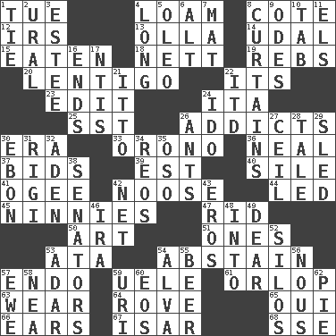 ACROSS 1. Third day of the wk. 4. Rich soil 8. ____ d'Azur (French Riviera) 12. Big collection agency 13. Rounded earthenware pot or jar 14. Allodial 15. Consumed 18. Remaining after all deductions 19. Confederate soldiers (slang) 20. Small, flat, pigmented spot on the skin 22. ___ a Wonderful Life 23. Prepare for publication 24. Call ___ day 25. Fast jet (abbr.) 26. Inveterate users 30. Epoch 33. U. of Maine site 36. Actress Patricia 37. Auction offers 39. Eastern Standard Time (abbr.) 40. Drop; flow; fall 41. Double curve, resembling the letter S 42. Trap for birds or small mammals 44. Directed 45. Simpletons 47. To free from 50. Tate display 51. Singles 53. "One Day ___ Time" 54. Choose not to consume 57. Inside; within (prefix) 59. Ubangi River tributary 61. Fourth or lowest deck 63. Erode 64. Be footloose 65. Fr. "Yes" 66. Hearing organs 67. Austrian river, tributary to the Danube 68. Compass dir. DOWN 1. Neckwear 2. Mountain range 3. First name in cosmetics 4. Yearn 5. Margarine 6. Keyboard modifier key 7. Floor protector 8. Window treatments 9. Lyric poems 10. Keyboard key 11. Raised railways 16. Extremities 17. Nuclear Threat Initiatives 21. "Tell ____ the Marines!" 22. It would 24. Wedding promise 26. Pismires 27. To provide with a ceiling 28. Lie 29. Downhill vehicle 30. Inky black, to poets 31. Swiss mountan, "Queen of the Mountains" 32. An important port of Yemen 34. Vintage cars 35. Bear (Spanish) 38. Legislators 42. Fish or hair follower 43. Greek god of love 46. Retirement account (abbr.) 48. To the inside or interior of 49. Letter starter 52. Grain storage towers 53. The sixth month of the Jewish calendar 54. Inventor's middle name 55. Fermented drink made from hops 56. Common sense 57. She-sheep 58. Teachers' org. 59. RI univ. 60. Greek goddess of the dawn 62. Sliced dessert