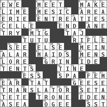 ACROSS 1. She-sheep 4. Rendezvous 8. Create 12. Welles in "The Third Man" 14. Mesonic 16. Type of rug 17. One of the Great Lakes 18. Pleas 20. Cell (Danish) 22. Conclude 23. One (Scot) 24. Attempt to accomplish something 25. Russian fighter aircraft 28. _ Mahal 30. Ballerina skirt 31. Firearm 35. Observe 37. Otherwise 40. Count _ (2 wds.) 41. Having or resembling wings 42. Women servants 44. Not women's 45. Old wives' tales, e.g. 46. Broad smile 47. Binary compound 48. Portable shelters 50. Prong on a fork 52. Curvy letter 54. Health resort 55. Opposite of masc. 58. Hearing organ 61. Make lace 63. Honkers 65. Interpreter 70. Stalk of a moss capsule 71. False hair 72. Marketplace scale 73. Paradise 74. At sea 75. Double curve, resembling the letter S 76. Fast jet (abbr.) DOWN 1. Voters do this 2. One who wires 3. Poet Dickinson 4. Madame (abbr.) 5. Car or cant ending 6. Eastern Standard Time (abbr.) 7. Become fatigued 8. Floor covering 9. Roberta Peters solo 10. Peachy ____! 11. Relaxation 13. Snakelike fish 15. Penny 19. The sixth month of the Jewish calendar 21. Australian flightless bird 26. A whole individual unit 27. POW camp 29. Stevie Ray Vaughan's brother 30. Cigar-shaped 32. Nourish 33. Actor's bit 34. Followers of ems 35. A type of plum 36. Merit 38. Title for a knight 39. Proofreads 41. The first octave above the treble staff 43. Clip 49. Fast planes 51. Tired old horse 53. Table seasoning 55. Gives food to 56. _____ Park, CO 57. Intended 58. Singer James 59. Ancient Greek god of war 60. Assign a rank or rating to 62. Edible starchy tuberous root 64. Compass dir. 66. Teachers' org. 67. Coat; cloak 68. Single 69. To riddle
