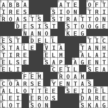 ACROSS 1. Swedish rock group 5. Had dinner 8. Often (poetically) 11. Angers 12. The Jewish people; Israel 13. Three (prefix) 14. Ridicules or criticizes harshly 17. Ski resort town in Vermont 19. Cease 21. Moe Howard, for one 22. Billionth: prefix 23. Barrel 24. Eastern Standard Time (abbr.) 27. Small valley 29. Nervous spasm 32. Showing deterioration from age 34. By way of 36. Hyperbolic tangent 37. Become fatigued 38. Shade tree 39. Jai ____ 40. Otherwise 41. Plant excrement 42. Representative 43. Biblical high priest 44. To provide with a ceiling 46. Ocean 47. Opposite of masc. 50. Wander 52. Unrefined 55. Gossips 57. One to whom something is allotted 59. Beer mug 62. Luau accessory 63. Greek god of love 64. Have the gumption 65. Car dealer's back yard 66. Male child 67. Heroin DOWN 1. Wind 2. Sis' sibling 3. Necklace unit 4. NE Netherlands city 5. Small island 6. Cod relative 7. Maternal 8. "Beetle Bailey" pooch 9. Toadlike animal 10. Prong on a fork 12. Fast jet (abbr.) 15. Sadhe (variant) 16. Trig term 18. Coat; cloak 20. Finds the solution 24. First name in cosmetics 25. Not moving 26. Tarsus (plural) 28. Pale purple color 29. Lies 30. Lacking in sense or substance 31. Riviera of "Kiss of the Spider Woman" 33. Area sheltered from the wind 35. Electrical Unit 36. Label 42. Having winglike extensions 45. Charged particles 47. Back 48. _____ Park, CO 49. Paris' subway 51. Unmarried girls 52. Give a ring to 53. Butter sub 54. Set down 55. Consenting reply 56. Neighbor of Neb. 58. Age 60. Epoch 61. Part of a journey