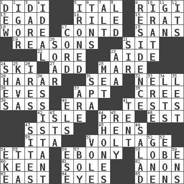 ACROSS 1. "You Light Up My Life" star Conn 5. Slanted text style (abbr.) 9. Swiss mountan, "Queen of the Mountains" 13. Mild oath 14. Cause heat under the collar 15. Part of Q.E.F. 16. Had on 17. Continued (abbr.) 18. Without 19. Thinks logically 21. Be seated 22. Old wives' tales, e.g. 23. Helper 24. What Jean-Claude Killy likes to do 27. Say or write further 28. Female horse 29. Ethiopian city, capital of Harari 31. Ocean 32. 1994 drama film starring Jodie Foster 36. Nights before holidays 37. Fitting 38. Algonquian 39. Backtalk 40. Epoch 41. Trials 42. Small island 44. Before (prefix) 46. Eastern Standard Time (abbr.) 47. Fast planes 48. Coop moms 50. Call ___ day 51. Electrical Measurement 54. Singer James 56. Dark wood 58. Ear part 60. Peachy ____! 61. Not divided or shared with others 62. At once, immediately (arch.) 63. Compass direction 64. Snake ____ (dice throw) 65. Cub Scout units DOWN 1. Morning condensation 2. Russian composer Stravinsky 3. Have the gumption 4. Standard of perfection 5. Pressed 6. Canisters 7. The first octave above the treble staff 8. Directed 9. Home 10. Feeling or showing extreme anger 11. Separate the seeds from cotton 12. ___ a Wonderful Life 17. Drawstring 20. Fly high 21. Title for a knight 23. Auto club (abbr.) 24. "______ My Girl" (Turtles hit) 25. Polynesian shrub of the pepper family 26. Angers 28. Was introduced to 30. Helper 31. Health resort 33. Celtic language 34. Allows 35. For fear that 37. "We ___ not amused" (Victoria) 40. Raised railways 41. Portable shelter 43. R.R. building 44. Gives a jingle 45. Have trust in 47. Locates 49. Vegetable dish 51. Short-tailed, large-bodied rat 52. Went 53. Inky black, to poets 54. Supplement with great effort 55. Afternoon social gathering 56. Compass dir. 57. Male child 59. Followers of ems