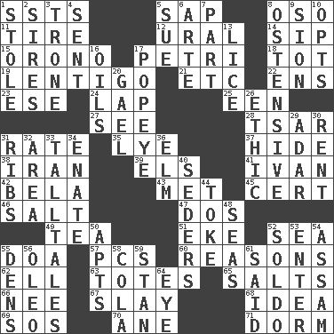 ACROSS 1. Fast planes 5. Plant excrement 8. Bear (Spanish) 11. Hoop that covers a wheel 12. Mountain range 14. Small drink 15. U. of Maine site 17. _ dish (used to culture cells) 18. Small child 19. Small, flat, pigmented spot on the skin 21. And so on (abbr.) 22. Followers of ems 23. Compass dir. 24. Pet locale 25. Car or cant ending 27. Observe 28. Russian ruler of old 31. Assign a rank or rating to 35. Potassium hydroxide 37. Flintstone garb 38. SW Asia republic 39. Raised railways 41. _ the terrible 42. Actor Lugosi 43. Was introduced to 45. An absolute certainty 46. Table seasoning 47. Two (Sp.) 49. Afternoon social gathering 51. Make supply last 52. Ocean 55. ___ good deed 57. Personal Computers (abbr.) 60. Thinks logically 62. Pipe bend 63. Hauls 65. Table seasonings 66. Born 67. Kill 68. It may be bright or harebrained 69. Mayday 70. One (Scot) 71. Dormintory (informal) DOWN 1. Fur scarf 2. Male parents of animals 3. Marketplace scale 4. Posted 5. Institute legal proceedings 6. Johnson of "Laugh-In" 7. Piece 8. Clearly or manifestly demonstrative 9. The Jewish people; Israel 10. Chooses 13. Louse (plural) 16. Petroleums 17. Wimpy's pal 20. Highlander 26. Moral principle 29. The sixth month of the Jewish calendar 30. Monthly bill 31. Teases 32. Type of rug 33. Baron Munchausen's specialties 34. Related on the mother's side 36. Shade tree 40. Spring feasts 44. Puff or smoke 48. Oceans 50. Tenement units (abbr.) 52. Twentieth part of a lira 53. Keyboard key 54. Indian state 55. Cub Scout units 56. Butter sub 58. Root beer relative 59. Comedian Laurel of Laurel & Hardy 61. Stated 64. Sight organ