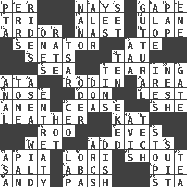 ACROSS 1. For each 4. Negative votes 8. Open wide 12. Three (prefix) 13. Toward shelter 14. ____ Bator, Mongolia 15. Zeal 18. Political cartoonist Thomas 19. Drink excessively 20. Elected representative 22. Had dinner 23. Puts into a specified state 24. The 19th letter of the Greek alphabet 25. Ocean 26. Pulling apart 30. _ moment's notice (2 wds.) 33. "The Thinker" sculptor 36. Type of rug 37. Olfactory organ 39. Spanish title 40. For fear that 41. So be it 42. Stop 44. A female animal or person 45. Cordwainer's material 47. Krazy ___ of comics 50. Friend of Pooh 51. Nights before holidays 53. Soggy 54. Inveterate users 57. Capital of Western Samoa 59. Australian parrot (variant) 61. Yell 63. Table seasoning 64. Lettered men learn these first 65. Sliced dessert 66. Actor Griffith 67. Romantic infatuation 68. R.R. building DOWN 1. Parent Teacher Assoc. 2. Blunders 3. Amusement-park features 4. Billionth: prefix 5. Having or resembling wings 6. It is so 7. Put into a specified state 8. From the throat 9. _ vera 10. Infant food 11. Compass dir. 16. Washington bills 17. Assign a rank or rating to 21. Russian ruler of old 22. American Automobile Association (abbr.) 24. Nine, plus one 26. Airtight sealed metal containers 27. Angers 28. Tender 29. Yard entry 30. Of or related to the anus 31. Heavy book 32. At sea 34. River in Europe 35. ___ good deed 38. Plea 42. Corporate head (abbr.) 43. Made supply last 46. Being at a high temperature 48. Opinion 49. Technology 52. Discontinues 53. Rampant 54. Arches 55. Food container 56. Costume for a special activity 57. White ___ sheet 58. Baking dish 59. Infant locale 60. Chief or king in Benin or Nigeria 62. Afternoon social gathering