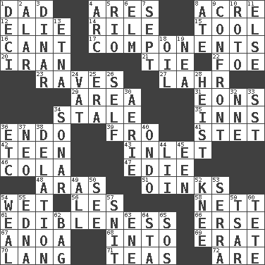 ACROSS 1. Male parent 4. Ancient Greek god of war 8. Measure of real estate 12. Writer Wiesel 14. Cause heat under the collar 15. Utensil 16. Patter 17. Parts 20. SW Asia republic 21. Make a knot 22. Enemy 23. All-night dance parties 27. Cowardly lion portrayer 29. Length times width 31. Immeasurably long periods of time 34. Lacking originality or spontaneity 35. Lodging establishments 36. Inside; within (prefix) 39. From 41. Proofreading order 42. Adolescent 43. An arm off of a larger body of water 46. Root beer relative 47. Singer Brickell 48. Ancient river in northeast Turkey 51. Pig sounds 54. Soggy 56. French article 58. Remaining after all deductions 61. The property of being fit to eat 66. Celtic language 67. Small Philippine buffalo 68. To the inside or interior of 69. Part of Q.E.F. 70. Austrian-born American filmmaker Fritz 71. Beverages made from leaves 72. "We ___ not amused" (Victoria) DOWN 1. Tenth: prefix 2. Having or resembling wings 3. Middle Eastern gold or silver currency 4. Curve 5. River (Sp.) 6. Shade tree 7. Back-to-school mo. 8. Had dinner 9. Meet 10. Printing process, for short 11. Otherwise 13. Inactive volcano in Sicily 18. Petroleum 19. Teachers' org. 24. Large container 25. Epoch 26. Automatic 28. Robbery 30. Nest on high 32. Compass dir. 33. Fast jet (abbr.) 34. Echolocation 36. And so on (abbr.) 37. Modern: prefix 38. Conveyance 40. Southwest Nigerian state 44. Cards in a Roman deck? 45. Car or cant ending 49. 100% 50. Observe 52. Leg joint 53. Spanish missionary in California 54. Welt 55. Pulitzer Prize-winning author Ferber 57. In a ____ (agitated or irritated) 59. Russian ruler of old 60. False hair 62. Container for groceries 63. Compass dir. 64. R.R. building 65. Mayday
