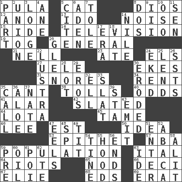ACROSS 1. Monetary unit of Botswana 5. Domesticated feline 8. "Vaya con ____" 12. Soon (poet.) 13. Wedding promise 14. Annoying sound 15. Travel on an animal 16. Boob tube 19. Coat; cloak 20. Commissioned military rank 21. 1994 drama film starring Jodie Foster 23. Had dinner 24. Raised railways 27. Ubangi River tributary 30. Supplements with great effort 31. Sounds asleep 34. Monthly bill 35. Patter 38. For Whom the Bell _____ 40. Probability 41. Having or resembling wings 42. Scheduled 44. Globular water bottle used in Asia 45. Docile 46. Area sheltered from the wind 47. Eastern Standard Time (abbr.) 50. It may be bright or harebrained 53. Curse 57. Basketball assoc. 59. Census information 63. Slanted text style (abbr.) 64. Debaucheries 65. Lower and raise head in agreement 66. Tenth: prefix 67. Writer Wiesel 68. Begley and Asner 69. Part of Q.E.F. DOWN 1. Component 2. The state of being joined or united 3. Inn 4. A saturated hydrocarbon 5. Quote 6. An important port of Yemen 7. Lacquered or enameled metalware 8. Two (Sp.) 9. One more than two 10. Bear (Spanish) 11. Elected rep. 14. Mediterranean tributary 17. Period 18. Large container 20. Small, secluded valley 22. A period of five years 24. Supplemented with great effort 25. Grant temporary use of 26. Fast planes 28. Car dealer's back yard 29. Greek god of love 30. Worn away 32. Pipe bend 33. Narrow board 35. Give a ring to 36. _ vera 37. Nathan's nickname 39. R.R. building 43. Send forth 47. Snakelike fish 48. Health resort 49. Teat (slang) 51. Keyboard key 52. Phillipine bananalike plant 54. Prong on a fork 55. Parka part 56. Conclusions 58. Came down and settled, as after flight 59. Before (prefix) 60. Lubricate 61. Luau course 62. Shoshoni 63. Binary compound