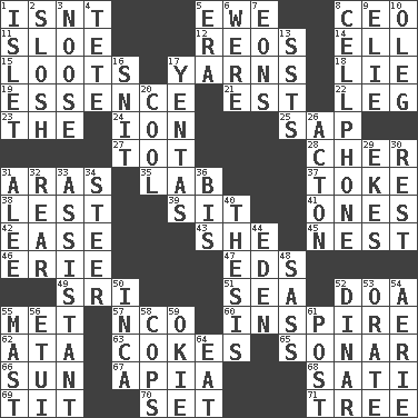 ACROSS 1. Is not 5. She-sheep 8. Corporate head (abbr.) 11. _ gin 12. Vintage cars 14. Pipe bend 15. Plunders 17. Tall tales 18. Untruth 19. Substance 21. Eastern Standard Time (abbr.) 22. Part of a journey 23. Definite Article 24. Electrically charged atom 25. Plant excrement 27. Small child 28. "Mermaids" star 31. Ancient river in northeast Turkey 35. Experiment locale 37. Puff or smoke 38. For fear that 39. Be seated 41. Singles 42. Comfort 43. A female animal or person 45. Egg locale 46. One of the Great Lakes 47. Begley and Asner 49. _ Lanka 51. Ocean 52. ___ good deed 55. Was introduced to 57. Non-commissioned officer (abbr.) 60. Motivate 62. "One Day ___ Time" 63. Popular sodas 65. Echolocation 66. Player for Phoenix 67. Capital of Western Samoa 68. Suttee (variant) 69. Teat (slang) 70. Arrange properly for use 71. Family _ (genealogy) DOWN 1. Small island 2. Agitate, as a liquid 3. Trap for birds or small mammals 4. Wig 5. Epoch 6. Past tense of be (plural) 7. Immeasurably long periods of time 8. Portable communications device 9. Writer Wiesel 10. Cassini of fashion 13. Fast planes 16. In a ____ (agitated or irritated) 17. Gossips 20. Calm and collected 26. 13-14th century defensive garment 29. Makes supply last 30. Respite 31. Toward shelter 32. Hitchcock's "____ Window" 33. Aide 34. Navigate 36. Twice 40. College paper 44. Paradise 48. Backtalk 50. South American Indian 52. Middle Eastern gold or silver currency 53. Declaim 54. Nest on high 55. Vertical spar for supporting sails 56. Needle holder 58. 911 reaches them 59. Migrant worker of the '30s 61. Mail 64. Ingest