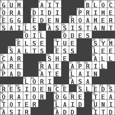 ACROSS 1. Chewing product 4. Small island 7. Group of countries in special alliance 11. Mouth or opening 12. "You Light Up My Life" star Conn 13. First class 14. Ovum 15. Locale of original sin 16. Nomad 17. Moves on water 19. Helper 21. Petroleum 23. Lyric poems 24. Otherwise 25. Third day of the wk. 26. Symbol (abbr.) 29. Table seasonings 30. Curvy letter 31. Area sheltered from the wind 32. 4-wheeled motor vehicle 33. A female animal or person 34. 100% 35. "We ___ not amused" (Victoria) 36. Actress Charlotte 37. Showery time 40. Writing tablet 41. Had dinner 42. (Had) reclined 43. Australian parrot (variant) 45. White ___ sheet 46. Dwelling 51. Bobsleighs 55. Speaker 56. Legendary monster 58. Afternoon social gathering 59. Carrier 60. Put down 61. Corn or form start 62. SW Saudi Arabia district 63. Find the sum of 64. It would DOWN 1. Travels 2. Capital and largest city of Mongolia 3. Wise men 4. Assist 5. It may be bright or harebrained 6. Canisters 7. Naughty children 8. Pale green bean 9. Sign of things to come 10. Foregone conclusion 12. Stop 13. Airs 16. Amusement-park features 18. Hang loosely or laxly 20. Lush 22. French article 24. Having ears or earlike features 25. Giggle 26. Killed 27. Shout 28. Cartoonist voice _ Blanc 29. "Two Mules for Sister ____" 32. Head covering 33. Smooth fabric 36. Less widely known 37. Insect wing 38. Went by 39. Monetary unit of Yemen 43. 61 cubic inches 44. Scent 46. Round or rotation of duties 47. Greek god of love 48. Suttee (variant) 49. Root beer relative 50. Mild oath 52. Needle holder 53. Scratch 54. Alleged 57. To free from