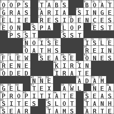 ACROSS 1. I made a mistake 5. Bar bills 9. Water vessel 13. Pate de foie ____ 14. Roberta Peters solo 15. Burn superficially 16. Writer Wiesel 17. Dwellings 19. A really long time 20. Health resort 21. Chop off 22. Eastern Standard Time (abbr.) 23. Inconspicuous attention getter 25. Fast jet (abbr.) 26. Annoying sound 30. Capri or Wight 34. Profane or obscene expressions 35. It's straight from the horse's mouth 36. Soared 39. Gospel singer Marvin 42. Singles 43. French philosopher Descartes 44. Japanese brewing company 46. Wrote a lyric poem 47. Feeling or showing extreme anger 48. Compass dir. 51. First man 54. Set 57. John Ritter's dad 58. Leather borer 60. Teachers' org. 62. Appease 65. Oceans 66. Settings 67. Position in a hierarchy or organization 68. Hyperbolic tangent 69. Singe 70. Scottish caps 71. Johnson of "Laugh-In" DOWN 1. Double curve, resembling the letter S 2. Lowest deck of a ship 3. Aches 4. Compass dir. 5. Canvas cover 6. Type of rug 7. Twice 8. Travel by water 9. Storage container 10. At one time in the past 11. Eras 12. Trial 15. Back-to-school mo. 18. Two (Sp.) 20. Portico 24. Overwhelmed 27. ___ a Wonderful Life 28. A female animal or person 29. 1973 Nobel Price Winner (Physics) Leo 30. Pressed 31. Elected rep. 32. Whopper 33. Followers of ems 36. Away 37. Directed 38. Compass dir. 40. Title for a knight 41. Period 45. Slanted text style (abbr.) 48. Nuclear Threat Initiatives 49. Fish or hair follower 50. Be 52. Approach 53. Intended 54. Global Positioning Systems (abbr.) 55. One of the Great Lakes 56. Globular water bottle used in Asia 58. Tiny particle 59. Moistens 61. American tennis player Robert 63. For each 64. Chicken ___ king 65. R.R. building