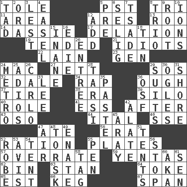 ACROSS 1. Lacquered or enameled metalware 5. Pacific Standard Time (abbr.) 8. Three (prefix) 11. Length times width 12. Ancient Greek god of war 13. Friend of Pooh 14. Hyrax 17. Conveyance 19. Looked after 21. Foolish or stupid persons 22. (Had) reclined 23. Commissioned military rank (abbr.) 24. Big _ 27. Remaining after all deductions 29. Mayday 32. Peak District village in England 34. Reproach for some lapse or misdeed 36. Ending for "Through" and "Enough" 37. Become fatigued 38. Epoch 39. Grain storage tower 40. Hero or heavy, e.g. 41. Double-curved letter 42. Following 43. Bear (Spanish) 44. Slanted text style (abbr.) 46. Compass dir. 47. Had dinner 50. Part of Q.E.F. 52. Food allowance for one day 55. Food holders 57. Make much ado about nothing 59. Gossips 62. Storage container 63. Comedian Laurel of Laurel & Hardy 64. Puff or smoke 65. Eastern Standard Time (abbr.) 66. Cask 67. Connect, as a bridge DOWN 1. Small amount or degree 2. Mouth or opening 3. For fear that 4. Artist's stand 5. Before (prefix) 6. Former Milwaukee Brewers owner Bud 7. Sadhe (variant) 8. Musical group of three 9. Carrot, for example 10. Charged atoms 12. Increase 15. Silly 16. Singer Brickell 18. Metal container 20. Main course 24. Paris' subway 25. Goodbye (Sp.) 26. Monte _, Las Vegas Hotel/Casino 28. Tarsus (plural) 29. Sets or collections 30. Stares 31. Dinah or Pauly 33. Area sheltered from the wind 35. Soft color 36. Order of Saint Francis (abbr.) 42. Having winglike extensions 45. Like ___ of sunshine 47. Atmosphere 48. Cod relative 49. Related on the mother's side 51. Portable shelters 52. Loose flowing garment 53. Advice 54. Portable shelter 55. Animal enclosure 56. Close up, plug up 58. Label 60. Alias (abbr.) 61. Elected rep.