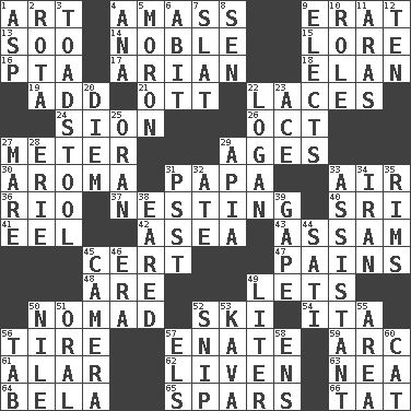ACROSS 1. Nonscientific branch of learning 4. Collect or gather 9. Part of Q.E.F. 13. "Barney Miller" actor Jack 14. Impressive in appearance 15. Old wives' tales, e.g. 16. Parent Teacher Assoc. 17. Believer in; advocate of (suffix) 18. Enthusiasm 19. Find the sum of 21. Baseball player Mel 22. Shoestrings 24. The Jewish people; Israel 26. Sep. follower 27. Distance measurement 29. Eons 30. Scent 31. Dad 33. Atmosphere 36. River (Sp.) 37. Nestling 40. Indian title of respect (Mr.) 41. Snakelike fish 42. At sea 43. Indian state 45. Certainty 47. Aches 48. "We ___ not amused" (Victoria) 49. Allows 50. Wanderer 52. What Jean-Claude Killy likes to do 54. Call ___ day 56. Become fatigued 57. Related on the mother's side 59. Curve 61. Having or resembling wings 62. Make or become more lively 63. Teachers' org. 64. Actor Lugosi 65. Practice fights 66. Make lace DOWN 1. Cleo's killer 2. Round or rotation of duties 3. Inedible or poisonous agaric 4. Santa ___, CA 5. Person of subnormal intelligence 6. "This won't hurt ____!" 7. Narrow board 8. Elected rep. 9. Opts 10. Hero or heavy, e.g. 11. Caspian sea tributary 12. "___ Little Indians" 20. South Vietnam president (1954) 22. Utah city north of Ogden 23. Adept person 25. Northwest Algerian city 27. Female horse 28. One of the Great Lakes 29. Capital of Western Samoa 31. Inconspicuous attention getter 32. Had dinner 33. Helper 34. SW Asia republic 35. Basketball hoops 38. Having ears or earlike features 39. Yawn 44. Suttee (variant) 45. Device for capturing images 46. Epoch 49. 61 cubic inches 50. Mediterranean tributary 51. Relating to the mouth 52. Clip 53. Polynesian shrub of the pepper family 55. Length times width 56. Bar bill 57. Raised railways 58. Followers of ems 60. Domesticated feline