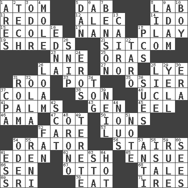 ACROSS 1. Smallest unit of an element 5. Small moist lump or mass 8. Experiment locale 11. Make new 12. Actor Baldwin 14. Wedding promise 15. Learning spot: Fr. 17. Grandmother 18. Frolic 19. Fragments 21. "Cheers" or "Ellen" 23. Compass dir. 25. Mouths or openings 26. Den 27. And not 28. Potassium hydroxide 31. Friend of Pooh 33. Cooking vessel 35. Flexible twig of a willow tree 37. Root beer relative 38. Boy, to dad 40. Southern CA. univ. 41. Insides of hands 43. Commissioned military rank (abbr.) 45. Snakelike fish 46. Housemaid (var.) 47. Small bed 50. Charged atoms 52. Conductor's collection 53. Nilotic language 54. Speaker 56. Flight of steps 61. Paradise 62. Delicate 65. Follow as a consequence or result 66. Elected rep. 67. Von Bismarck 68. Lie 69. Indian title of respect (Mr.) 70. Ingest 71. Angers DOWN 1. Ancient Greek god of war 2. Technology 3. Scent 4. Undercover agent 5. One of the 12 tribes of Israel 6. Insect wing 7. Gillaume's butler role 8. _ and Stitch 9. First man 10. Male child 13. Capital of Egypt 16. Pulitzer Prize-winning author Ferber 18. Personal Computers (abbr.) 20. Sever or remove by pinching or nipping 22. Edible starchy tuberous root 24. Greek god of love 26. Rich soil 28. Louse (plural) 29. Shout 30. Period 31. Wander aimlessly 32. Water jar 34. Coat; cloak 36. Institutes legal proceedings 37. Accounting whiz (abbr.) 39. Famous astronaut Armstrong 42. Get outta here! 44. Good sense 48. U. of Maine site 49. Cylindrical with tapered ends 51. Brief written record 52. Avid follower 54. River in Europe 55. Painter Guido (1575-1642) 57. Opposed to 58. Austrian river, tributary to the Danube 59. Court order 60. Observes 61. Curvy letter 63. R.R. building 64. Being at a high temperature
