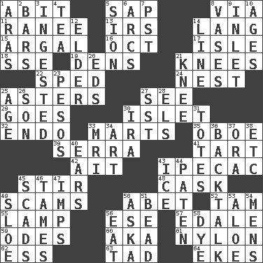 ACROSS 1. "This won't hurt ____!" 5. Plant excrement 8. By way of 11. Indian princess (variant) 13. Big collection agency 14. Long (Scottish) 15. Therefore, facetiously 16. Sep. follower 17. Capri or Wight 18. Compass dir. 19. Cub Scout units 21. Leg joints 22. Hurried 24. A home for chicks 25. Michaelmas daisies 27. Perceive with the eye 29. Travels 30. Small island 32. Inside; within (prefix) 33. Shops 35. Mitch Miller's instrument 39. Father Junipero _ 41. Small pie 42. Small island 43. Medicinal drug used to evoke vomiting 45. Disorderly outburst 48. Keg 49. Fraudulent business schemes 50. Collude with 52. Scottish cap 55. Desk light 56. Compass dir. 57. Peak District village in England 59. Lyric poems 60. Alias (abbr.) 61. High-strength synthetic material 62. Curvy letter 63. Bit 64. Makes supply last DOWN 1. Caspian sea tributary 2. Soap units 3. Eaten 4. Beverage made from leaves 5. The Jewish people; Israel 6. Arches 7. Pacific Standard Time (abbr.) 8. Flower holders 9. An arm off of a larger body of water 10. Eons 12. A person who is older than you are 14. Actor's bit 20. Begley and Asner 21. Leg joint 23. Mexican monetary units 25. Personal question 26. Boy, to dad 27. Fast jet (abbr.) 28. Raised railways 30. Lyricist Gershwin 31. Hauls 33. Medical imaging device (abbr.) 34. Tate display 36. Sass 37. Mouth or opening 38. And so on (abbr.) 40. Hearing organs 43. Frozen water 44. Eucharist need 45. Heaps 46. Domesticates 47. Naughty children 49. A type of plum 50. "____ silly question..." 51. Necklace unit 53. _ vera 54. Not women's 56. Consume 58. Color
