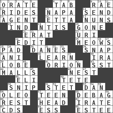 ACROSS 1. Speak pompously 6. Bar bill 9. Actress Charlotte 12. Amusement-park features 13. California wine valley 14. Transmit 15. Rep 16. Singer James 17. Religious women 18. Indiana (abbr.) 19. Nuclear Threat Initiatives 20. Went 21. Part of Q.E.F. 23. RI univ. 24. Prepare for publication 25. Catcalls? 28. Groovy apt. 30. Natives or inhabitants of Denmark 34. Fastener 35. Cuckoo 36. Memorize 38. Lyricist Gershwin 39. Ear part 41. Greek mythologigal hunter 43. Fast jet (abbr.) 44. Shopping centers 46. A home for chicks 48. Connecticut Ivy Leaguer 49. Wig 50. Sever or remove by pinching or nipping 51. Proofreading order 53. One of the 12 tribes of Israel 56. Butter sub 57. Adolescent 58. Debunk (Brit. slang) 60. Respite 61. Froth on beer 62. Feeling or showing extreme anger 63. Music discs 64. Double-curved letter 65. First name in cosmetics DOWN 1. Mouth or opening 2. Swiss mountan, "Queen of the Mountains" 3. An important port of Yemen 4. Watched over 5. Eastern Standard Time (abbr.) 6. Jacques of French films 7. Flats, for short 8. Sound made by sheep 9. One who advocates reunion 10. Queen of England 1702-14 11. Begley and Asner 13. Remaining after all deductions 14. Sounds asleep 19. Brizilian seaport 20. Chewing product 22. To free from 24. The property of being fit to eat 26. Armed conflicts 27. Petty quarrel 28. Inside of hand 29. Small Philippine buffalo 31. Modern: prefix 32. Hearing organ 33. Indian title of respect (Mr.) 37. Music written for nine 40. American author Paul (1891-1958) 42. Fish or hair follower 45. Small drink 47. Spring feasts 49. Be inclined (to) 50. Downhill vehicle 51. Perceives with the eye 52. Beverages made from leaves 54. Blind as ____ 55. Nathan's nickname 56. The grampus (Milton) 57. Definite Article 58. Pass on 59. Unit of force equal to gravity