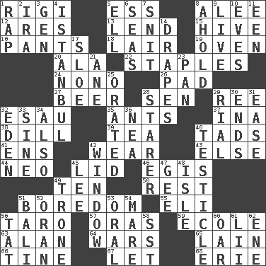 ACROSS 1. Swiss mountan, "Queen of the Mountains" 5. Curvy letter 8. Toward shelter 12. Ancient Greek god of war 13. Grant temporary use of 15. Hub of activity 16. Leg coverings 18. Den 19. Baking chamber 20. Insect wing 22. Paper fasteners 24. Words to Nanette 26. Groovy apt. 27. Fermented drink made from hops 28. Elected rep. 29. To separate or throw off 32. Son of Isaac 35. Pismires 37. _ tizzy (2 wds.) 38. Deli pickle 39. Beverage made from leaves 40. Small amounts or degrees 41. Followers of ems 42. Put on (as clothing) 43. Otherwise 44. Modern: prefix 45. Hat (slang) 46. Armor plate that protects the chest 49. Nine, plus one 50. Respite 51. Mood resulting from idleness 55. Biblical high priest 56. Pacific island yam 57. Mouths or openings 59. Learning spot: Fr. 63. ____ Jay Lerner 64. Armed conflicts 65. (Had) reclined 66. Prong on a fork 67. Allow 68. One of the Great Lakes DOWN 1. Strike 2. Retirement account (abbr.) 3. Commissioned mil. rank 4. Byzantium, centuries later 5. Pipe bend 6. Oceans 7. In a ____ (agitated or irritated) 8. Hold, grip (Informal) 9. Moving, as bait 10. Nights before holidays 11. Car or cant ending 14. Window treatments 17. _ gin 21. One (Scot) 23. Baking dish 25. Declaimed 28. A viewer who gazes fixedly 29. Monetary unit of Yemen 30. Conclusions 31. Relaxation 32. Paradise 33. Trig term 34. In addition 36. Teachers' org. 40. One of the two male reproductive glands 42. Light entry point 45. Area sheltered from the wind 47. Turn to the right 48. Capri or Wight 49. Heavy duty weighing machine 51. Indonesian resort city 52. NW Algerian seaport 53. Taken by mouth 54. Female horse 56. Make lace 58. Fast jet (abbr.) 60. Rowing implement 61. Cards in a Roman deck? 62. Compass dir.