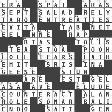 ACROSS 1. Epoch 4. Argument over a trivial matter 8. Ancient river in northeast Turkey 12. Back-to-school mo. 14. Vegetable dish 16. Have confidence or faith in 17. Edible starchy tuberous root 18. Pleas 20. Webber/Rice musical 22. Bar bill 23. Fish or hair follower 24. Snakelike fish 25. Compass dir. 28. Reproach for some lapse or misdeed 30. Prejudice 31. For Whom the Bell _____ 35. Beverage made from leaves 37. Portico 40. "Silly old bear" 41. Hang loosely or laxly 42. Pulls apart 44. Thin strip of wood or metal 45. Send forth 46. Indian titles of respect 47. _ tizzy (2 wds.) 48. Honkers 50. Make senseless or dizzy 52. "We ___ not amused" (Victoria) 54. Eastern Standard Time (abbr.) 55. Set 58. White ___ sheet 61. "___ Maria" 63. Dodge 65. Frustrate 70. ____ Jay Lerner 71. Hero or heavy, e.g. 72. Underwater navigation system 73. Indonesian resort city 74. Inside; within (prefix) 75. Suttee (variant) 76. Commissioned mil. rank DOWN 1. First name in cosmetics 2. Rob, plunder, or pillage 3. Showery time 4. Compass dir. 5. Baking dish 6. Keyboard modifier key 7. Small pie 8. Tate display 9. It's straight from the horse's mouth 10. Toward shelter 11. System (abbr.) 13. Small child 15. Letter starter 19. Blind as ____ 21. Cuckoo 26. Political cartoonist Thomas 27. _____ Park, CO 29. Cotton for raincoats, e.g. 30. Greek mezzo-soprano Agnes 32. Grant temporary use of 33. Globular water bottle used in Asia 34. Quiet! 35. Heavy book 36. Writer Wiesel 38. Boat paddle 39. Ascend 41. Part of a journey 43. Fast planes 49. Part of Q.E.F. 51. Shoshoni 53. Nights before holidays 55. POW camp 56. Peak District village in England 57. Soviet premier 1918-24 58. Measure of real estate 59. Within a short period 60. Old (Scot.) 62. Greek god of love 64. Experiment locale 66. Modern: prefix 67. Santa ___, CA 68. Feline 69. Three (prefix)
