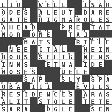 ACROSS 1. Hat (slang) 4. Not ill 8. Austrian river, tributary to the Danube 12. Lyric poems 14. Native American of Southwest Alaska 16. Have the gumption 17. Yard entry 18. Frustrating wastes of time 20. Forward in time 22. Before (prefix) 23. Make lace 24. Not either 25. Single 28. _ Mahal 30. Floor coverings 31. Firearm 35. Born 37. Slanted text style (abbr.) 40. Count _ (2 wds.) 41. Expressions of contempt or scorn 42. Former Milwaukee Brewers owner Bud 44. Not women's 45. Lodging establishments 46. Inactive volcano in Sicily 47. Binary compound 48. Olfactory organs 50. Ubangi River tributary 52. Plant excrement 54. Secret 55. Health resort 58. Chief or king in Benin or Nigeria 61. One more than two 63. Vices 65. Dwellings 70. Ancient river in northeast Turkey 71. Came down and settled, as after flight 72. Fur scarf 73. Wig 74. "Two Mules for Sister ____" 75. Stare at amorously 76. Elected rep. DOWN 1. Utah city north of Ogden 2. Potato state 3. Prevent from occurring 4. Armed conflict 5. Connecticut Ivy Leaguer 6. Part of a journey 7. Mass 8. Wedding promise 9. Table seasoning 10. Type of rug 11. State of inaction 13. Ocean 15. Small pie 19. Stern 21. ___ good deed 26. Nuclear Threat Initiatives 27. First name in cosmetics 29. Stevie Ray Vaughan's brother 30. Makes clutter 32. Nourish 33. Actor's bit 34. Followers of ems 35. Words to Nanette 36. Immeasurably long periods of time 38. Keyboard modifier key 39. "_ and Lucy" (Charlie Brown theme song) 41. Storage container 43. Highlander 49. Alleged 51. Sodium hydroxide 53. Sliced desserts 55. Founders of families 56. Food holder 57. NE Netherlands city 58. Mouths or openings 59. Actor Lugosi 60. SW Saudi Arabia district 62. To the inside or interior of 64. Large container 66. Call ___ day 67. Gear tooth 68. Pipe bend 69. Perceive with the eye