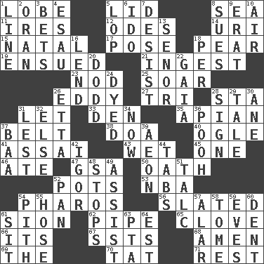 ACROSS 1. Ear part 5. Hat (slang) 8. Ocean 11. Angers 12. Lyric poems 14. RI univ. 15. Relating to or accompanying birth 17. Airs 18. Lightbulb-shaped fruit 19. Took place subsequently 21. Swallow 23. Dreamland 25. Fly high 26. Whirlpool 27. Three (prefix) 28. R.R. building 31. Allow 33. Lair 35. Bee-related 37. Waist strap 38. ___ good deed 40. Stare at amorously 41. Slender Brazilian palm 43. Dripping 45. Single 46. Had dinner 47. Girls' org. (abbr.) 50. Pledge 52. Cooking vessels 53. Basketball assoc. 54. N Egypt peninsula 56. Scheduled 61. The Jewish people; Israel 62. Corncob 65. Garlic unit 66. It is 67. Fast planes 68. So be it 69. Definite Article 70. Make lace 71. State of inaction DOWN 1. Actor's bit 2. Northwest Algerian city 3. Stakes 4. He sold his birthright 5. Chop off 6. Wedding promise 7. Stop 8. Institutes legal proceedings 9. Part of Q.E.F. 10. Wind 13. Sir (Sp.) 16. Grant temporary use of 18. For each 20. Texas town _ City 22. Greek goddess of the earth (variant) 24. Colored 26. Singer James 28. Public display of a written message 29. Falsehood 30. One (Scot) 31. For fear that 32. Otherwise 34. Immediately 36. "Silly old bear" 37. Sound made by sheep 39. Age 42. Composer Stravinsky 44. Bar bills 48. Constricts 49. Aid 51. Baby powder 52. Baking dish 54. Essential or central part 55. Flexible conduit 57. Having or resembling wings 58. Heavy book 59. Nights before holidays 60. Incision 61. Be seated 63. Parent Teacher Association (abbr.) 64. Eastern Standard Time (abbr.)