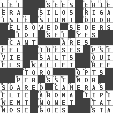 ACROSS 1. Allow 4. Observes 8. 4th largest of the Great Lakes 12. Period 13. Grain storage towers 14. Capital of Latvia 15. Small island 17. Difficult or unusual or dangerous feat 18. Aroma 19. Shoved, as through a crowd 21. Spring feasts 23. Small child 24. Put into a specified state 26. Consenting reply 27. Patter 28. Ancient Greek god of war 30. Snakelike fish 31. College papers 34. Pacific Standard Time (abbr.) 37. Compete 38. Table seasonings 39. Fr. "Yes" 40. Raised railways 41. Place for singles 42. To riddle 43. "Corrida" creature 44. Elects 46. For each 47. Fast jet (abbr.) 50. Not either 51. Flew 54. Devices for capturing images 57. Writer Wiesel 58. Odor 60. Native american tent (variation) 62. Left 63. Music written for nine 64. Make lace 65. Olfactory organ 66. Leaves 67. R.R. building DOWN 1. Luau accessory 2. Celtic language 3. Baron Munchausen's specialties 4. Settings 5. Evade 6. Age 7. Fast planes 8. Eats (away) 9. Amusement-park features 10. Composer Stravinsky 11. Hearing organs 13. Compass dir. 16. Inky black, to poets 20. Baseball player Mel 22. Snake ____ (dice throw) 25. Clothes sense 27. To provide with a ceiling 29. Repose 30. Night before a holiday 31. Russian ruler of old 32. Radiant circles of light 33. Pipe bend 34. Likenesses of persons 35. Institutes legal proceedings 36. Neckwear 41. Had on 43. Cigar-shaped 44. Single 45. Left side of a ship or aircraft 46. Aches 48. Biscuitlike quick bread 49. Softens 51. Stitched 52. Butter sub 53. Mild oath, euphamism for damn 55. Floor protector 56. Petty quarrel 59. Friend of Pooh 61. Call ___ day