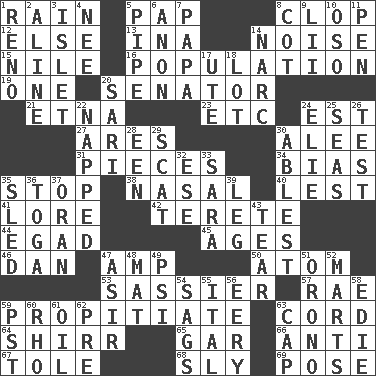 ACROSS 1. Water falling in drops from the sky 5. Infant food 8. Hoof sound 12. Otherwise 13. _ tizzy (2 wds.) 14. Annoying sound 15. "Death on the ____" 16. Census information 19. Single 20. Legislator 21. Inactive volcano in Sicily 23. And so on (abbr.) 24. Eastern Standard Time (abbr.) 27. Ancient Greek god of war 30. Toward shelter 31. Components 34. Prejudice 35. Close up, plug up 38. Rhinal 40. For fear that 41. Old wives' tales, e.g. 42. Cigar-shaped 44. Mild oath 45. Grows older 46. One of the 12 tribes of Israel 47. Electrical Unit 50. Tiny particle 53. More impudent 57. Actress Charlotte 59. Conciliate 63. Drawstring 64. Bake eggs in their shells 65. Slender fish 66. Opposed to 67. Lacquered or enameled metalware 68. Playfully artful 69. Introduce or present, as a question DOWN 1. Former U.S. Attorney General Janet 2. Place in a line 3. Small island 4. Born 5. Corncob 6. At once, immediately (arch.) 7. Dad 8. Small bed 9. Cards in a Roman deck? 10. Bear (Spanish) 11. Writing instrument 14. Drug cop 17. Shoshoni 18. Car dealer's back yard 20. Indian skirt 22. Slept 24. Writer Wiesel 25. Oceans 26. Trial 28. Car or cant ending 29. Jazz singing style 30. Most capable 32. Compass dir. 33. "Two Mules for Sister ____" 35. Downhill vehicle 36. Ancient Roman robe 37. Northwest Algerian city 39. Part of a journey 43. Pull apart 47. SW Saudi Arabia district 48. Floor covering 49. 23rd letter of the Greek alphabet 51. U. of Maine site 52. Shops 54. Settles 55. Slanted text style (abbr.) 56. Suggestive of the supernatural 58. Singer Brickell 59. Pacific Standard Time (abbr.) 60. 17th letter of the Greek alphabet 61. Petroleum 62. Before (prefix) 63. Head covering