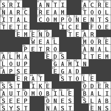 ACROSS 1. _ Lanka 4. Opposed to 8. Land measure 12. Drug cop 14. 480, 500 or 516 sheets of paper 15. Utensil 16. Slanted text style (abbr.) 17. Parts 20. Wig 21. Frozen water 22. Enemy 23. Make improvements or corrections to 27. Pull apart 29. Welt 31. Greater amount 34. Stone: prefix 35. Of or related to the anus 36. _ mater 39. Begley and Asner 41. A whole individual unit 42. Central Nebraska county 43. Street urchin 46. Domed church section 47. Mild oath 48. Part of Q.E.F. 51. Took without asking 54. Fast jet (abbr.) 56. Mamie's mate 58. River in Europe 61. Car 66. Indonesian resort city 67. Ooze 68. Singles 69. Broad, flat, thick piece 70. System (abbr.) 71. Political cartoonist Thomas 72. Followers of ems DOWN 1. In a ____ (agitated or irritated) 2. Assign a rank or rating to 3. Feeling or showing extreme anger 4. Curve 5. Modern: prefix 6. Scottish cap 7. Body of Kaffir warriors 8. Had dinner 9. Meet 10. Printing process, for short 11. Otherwise 13. Clement's nick name 18. Sep. follower 19. Born 24. She-sheep 25. Fish or hair follower 26. Have the gumption 28. At full speed 30. Cabin 32. Actress Charlotte 33. Shade tree 34. Some stationery 36. In the manner of 37. Chop off 38. French bagpipes 40. Settles 44. Floor protector 45. Wedding promise 49. Direct toward a target or goal 50. Ring climax 52. Tennis shots 53. Peak District village in England 54. Backtalk 55. Chop _ 57. Inky black, to poets 59. Style 60. Chest bones 62. Elect 63. _ tizzy (2 wds.) 64. French article 65. Eastern Standard Time (abbr.)