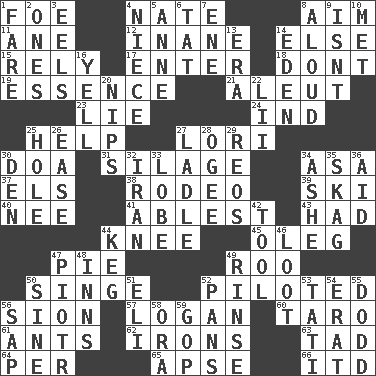 ACROSS 1. Enemy 4. Nathan's nickname 8. Direct toward a target or goal 11. One (Scot) 12. Lacking in sense or substance 14. Otherwise 15. Trust 17. Keyboard key 18. Do not 19. Substance 21. Native American of Southwest Alaska 23. Whopper 24. Indiana (abbr.) 25. Assist 27. Australian parrot (variant) 30. ___ good deed 31. Fodder prepared in a silo 34. White ___ sheet 37. Raised railways 38. Cowboy competition 39. What Jean-Claude Killy likes to do 40. Born 41. Most capable 43. Possessed 44. Leg joint 45. Cassini of fashion 47. Sliced dessert 49. Friend of Pooh 50. Scorch 52. Manned the helm 56. The Jewish people; Israel 57. Utah city north of Ogden 60. Edible starchy tuberous root 61. Pismires 62. Metal shackles 63. Bit 64. For each 65. Domed church section 66. It would DOWN 1. Conductor's collection 2. Washington bills 3. Snakelike fish 4. Sibling's daughter 5. Singer Murray 6. Make lace 7. Compass dir. 8. Verbally 9. Is not 10. Was introduced to 13. Epoch 14. Locale of original sin 16. Shout 20. Cuts off 22. Cards in a Roman deck? 25. Opening into or through something 26. Relaxation 27. Dipping utensil 28. Double curve, resembling the letter S 29. Vintage cars 30. Lair 32. SW Asia republic 33. Ear part 34. American tennis player Robert 35. Heroin 36. Help 42. Utensil 44. Cask 46. Spoils 47. Peter (Polish) 48. Taverns 49. Remove soap 50. Trig term 51. Biblical high priest 52. Baking dishes 53. Jacques of French films 54. Part of Q.E.F. 55. Texas town _ City 56. Plant excrement 58. Mouth or opening 59. Grand Old Party
