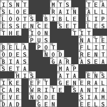 ACROSS 1. Is not 5. Mountains (abbr.) 8. Afternoon social gathering 11. A type of plum 12. Precipitation 14. 100% 15. Plunders 17. Instruction Manual for Humans 18. Mouth edge 19. Core 21. Arrange properly for use 22. French article 23. Definite Article 24. Electrically charged atom 25. Teat (slang) 27. Festering 28. Nathan's nickname 31. Actor Lugosi 35. Plant holder 37. Secret move to avoid paying debts 38. Lyric poems 39. Lower and raise head in agreement 41. Monthly bill 42. Prejudice 43. Slender fish 45. Toward the sea 46. Bristle 47. Atlas unit 49. Part of HMS, perhaps 51. _ moment's notice (2 wds.) 52. Followers of ems 55. D.D.E's nickname 57. Bank Draft (abbr.) 60. Commissioned military rank 62. 4-wheeled motor vehicle 63. Compose 65. Before Barbara or Clara 66. First lady 67. Connecting point 68. Thailand, formerly 69. June honoree 70. Commissioned mil. rank 71. Snakelike fish DOWN 1. Small island 2. Splash clumsily 3. Trap for birds or small mammals 4. Wig 5. Medical imaging device (abbr.) 6. Bar bills 7. Drop; flow; fall 8. Baron Munchausen's specialties 9. Writer Wiesel 10. High mountains 13. Remaining after all deductions 16. Clip 17. Gillaume's butler role 20. Clever action or accomplishment 26. Kind of red light 29. Prong on a fork 30. Singer James 31. Moves up and down 32. Singer Brickell 33. Resembling or made to resemble leather 34. Slender Brazilian palm 36. Coat; cloak 40. Break 44. Pace 48. Baking dishes 50. Stitched 52. Bert's buddy 53. Relating to or accompanying birth 54. Shuts with force 55. On the rocks 56. Polynesian shrub of the pepper family 58. Toadlike animal 59. Event that recurs at intervals 61. Relaxation 64. Nine, plus one